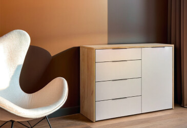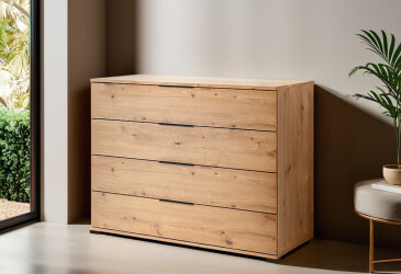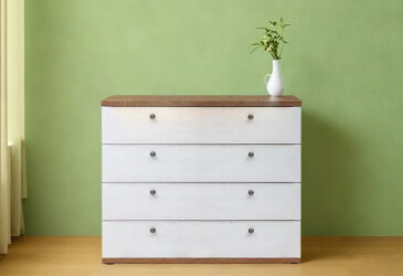 Комод оснащен четырьмя ящиками, которые благодаря телескопическим направляющим полного выдвижения обеспечивают легкий доступ к содержимому. Металлические ручки добавляют дополнительный шарм и прочность, что делает использование комода комфортным и долговечным. Данный товар изготовлен из качественной ламинированной ДСП, а фасады выполнены из ДСП с накладками МДФ, что гарантирует долговечность и устойчивость к повреждениям.