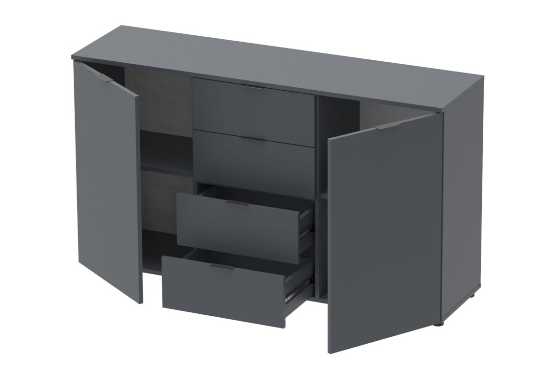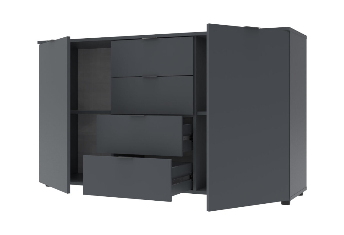Комод Doros Рон 5 — это идеальное решение для тех, кто ценит функциональность и стиль в интерьере. С шириной 140 см и высотой 81 см, он прекрасно впишется в любое пространство, будь то спальня, гостиная или прихожая. Этот комод сочетает в себе практичность и современный минималистичный дизайн, который станет гармоничным дополнением к вашему интерьеру. Его графитовый цвет придаст помещению современный вид, а лаконичные линии подчеркнут стильный подход к оформлению. Комод оснащен четырьмя вместительными ящиками и двумя дверками, что позволяет удобно организовать хранение вещей, от одежды до различных аксессуаров. Благодаря телескопическим направляющим полного выдвижения, доступ к содержимому ящиков будет максимально удобным и простым.