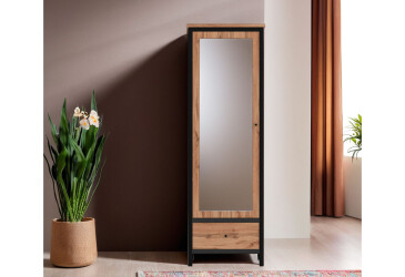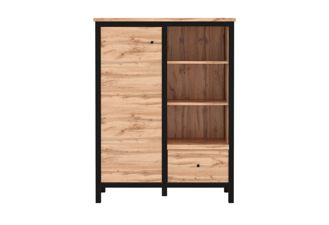 Комод оснащен одной дверцей, ящиком и открытыми полками, что позволяет удобно организовать пространство для хранения вещей. Благодаря этому, вы сможете хранить не только личные вещи, но и декоративные элементы, которые будут радовать глаз. Цвет дуб тахо придаёт изделию теплоты и уюта, а черные акценты создают стильный контраст, подчеркивающий современный дизайн.