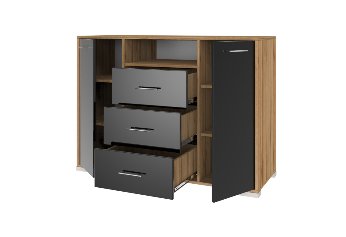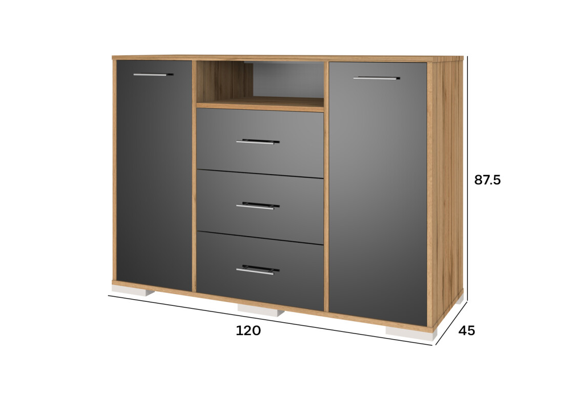 Комод Киевский стандарт Лира 2-дверный с 3 ящиками – это идеальное решение для тех, кто ценит сочетание функциональности, надежности и современного стиля. С шириной 120 см, высотой 87.5 см и глубиной 45 см, этот комод станет практичным элементом вашего интерьера, обеспечивая достаточное пространство для хранения вещей. Изготовленный из качественных материалов, таких как ламинированная ДСП и МДФ, он отличается прочностью и долговечностью. Металлические ручки придают ему стильный вид, а черный глянец в сочетании с цветом дуба аппалачи создаёт элегантный контраст, который украсит любую комнату. Благодаря телескопическим направляющим полного выдвижения, вы сможете легко открывать ящики и использовать пространство с максимальной эффективностью.