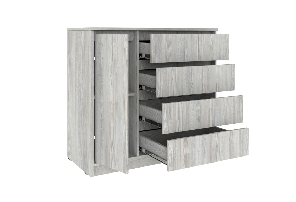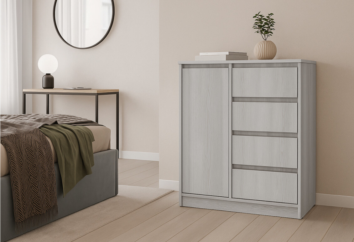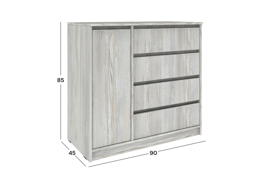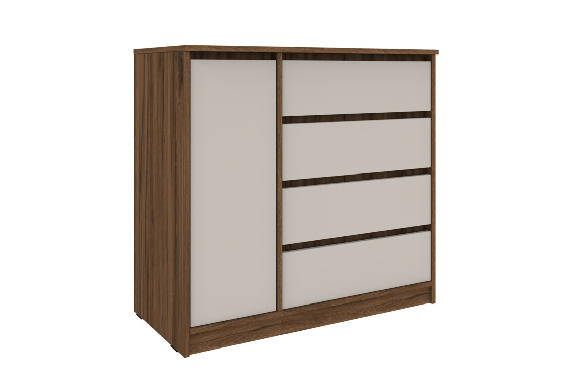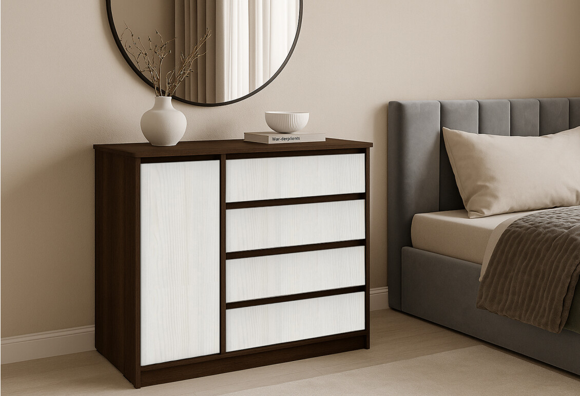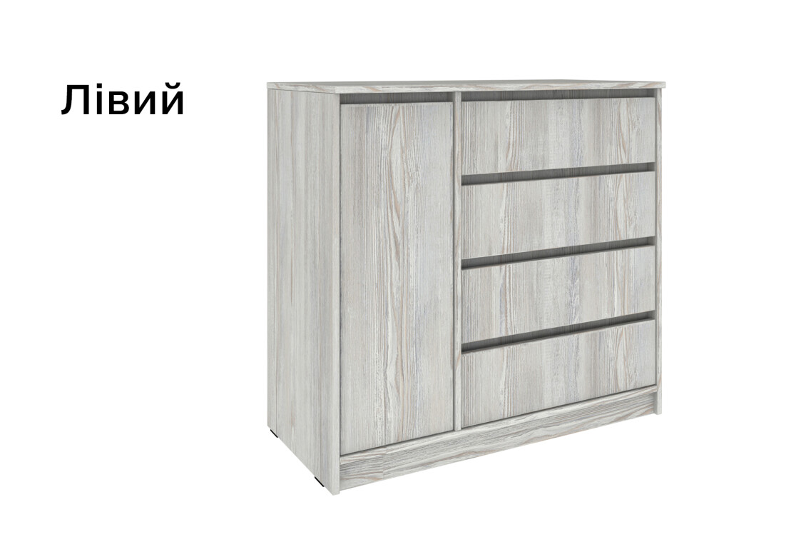 Комод Киевский стандарт №11 — это идеальное решение для тех, кто ценит функциональность и стиль в интерьере. Этот комод, выполненный в современном стиле, станет не только практичным элементом мебели, но и стильным акцентом в вашем доме. С шириной 90 см, высотой 85 см и глубиной 45 см, он отлично впишется в различные пространства, будь то спальня, гостиная или прихожая. Особенностью данного комода является наличие четырех вместительных ящиков и одной дверки, что позволяет удобно организовать хранение вещей и поддерживать порядок в вашем доме. Комод изготовлен из качественной ламинированной ДСП, что обеспечивает его надежность и долговечность, а также легкость в уходе. Вы сможете выбрать из множества доступных модификаций, что позволяет адаптировать этот комод под ваш интерьер и предпочтения. Доступные цвета корпуса и фасада включают как классические варианты, такие как дуб аппалачи и венге, так и более современные оттенки, такие как бетон и антрацит.