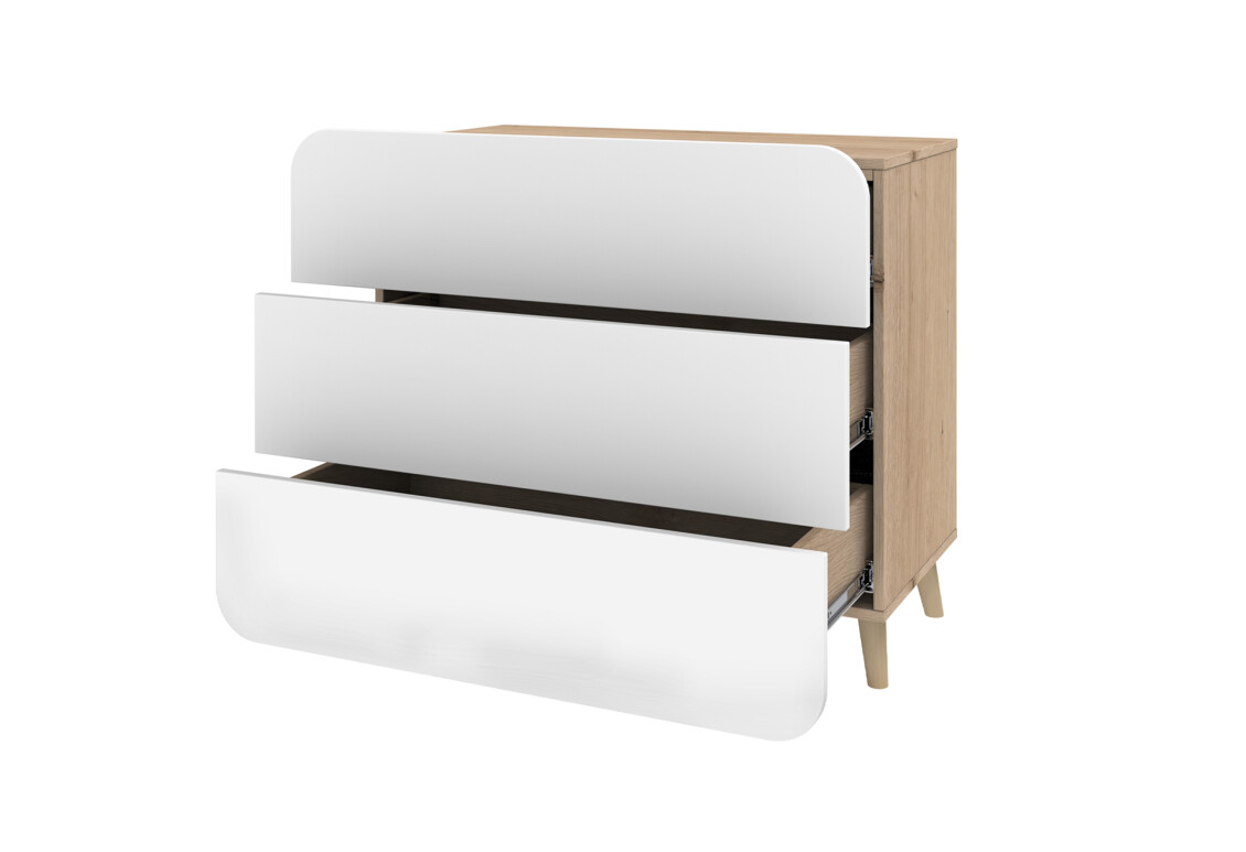 Ключевым преимуществом данного комода является его конструкция: три вместительных ящика, которые обеспечивают достаточное пространство для хранения вещей. Ящики оснащены телескопическими направляющими полного выдвижения, что гарантирует легкость и удобство при использовании. Важно отметить, что комод не имеет ручек, что подчеркивает его лаконичный дизайн и делает его еще более безопасным, особенно в домах с маленькими детьми. Ножки комода выполнены из дерева, что придает ему надежность и устойчивость.