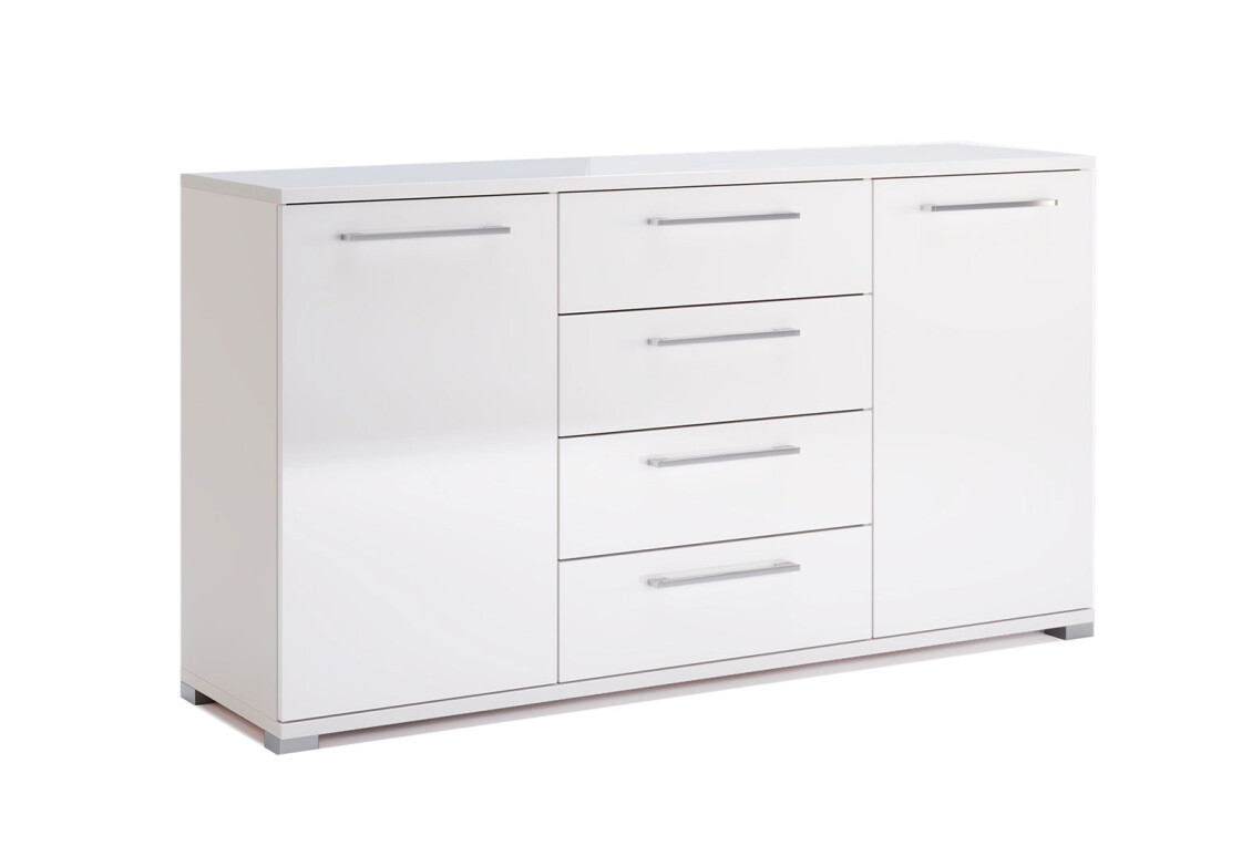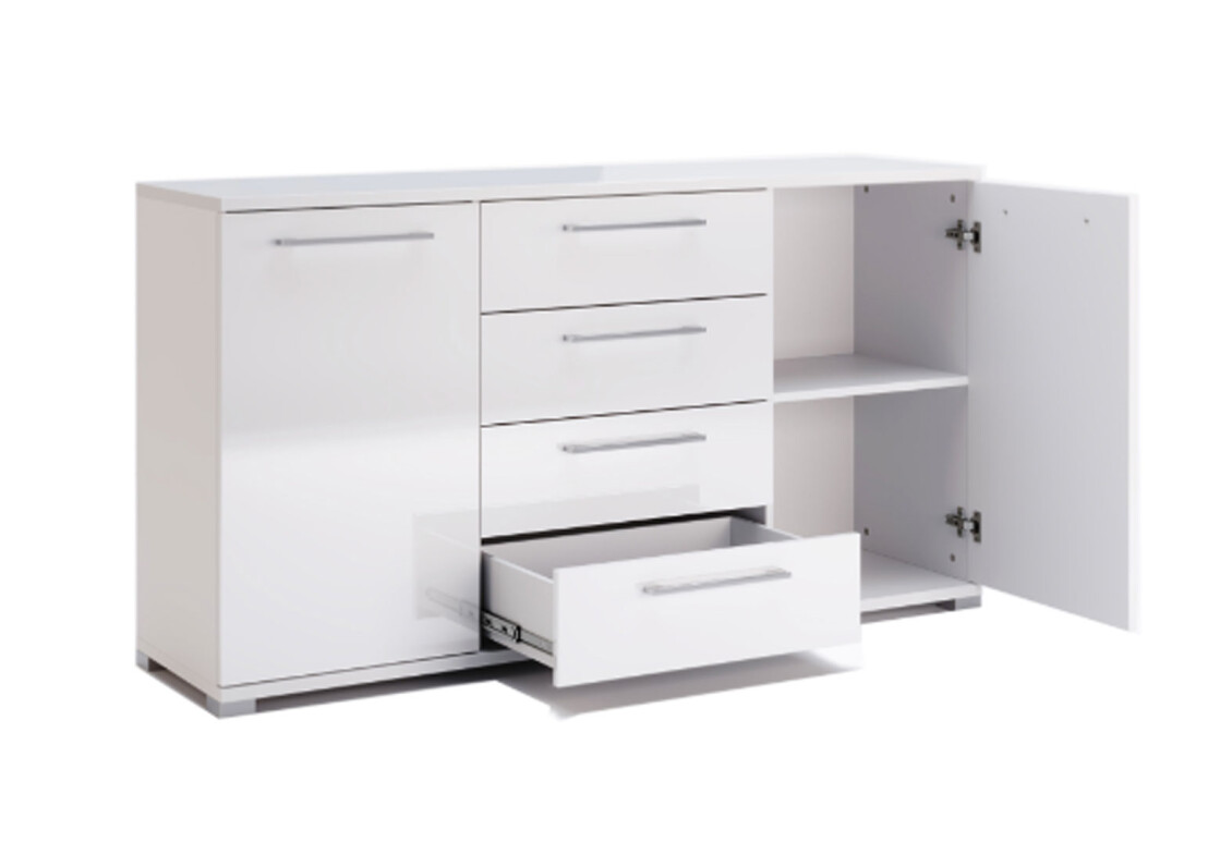 Комод MiroMark Фемили 2-дверный с 4 ящиками — это идеальное решение для тех, кто ценит функциональность и стиль в одном изделии. Его размеры (ширина 150.10 см, высота 82.30 см, глубина 40.00 см) позволяют удобно разместить его в любом помещении, будь то спальня, гостиная или прихожая. Белый цвет и минималистичный дизайн делают этот комод универсальным элементом интерьера, который легко впишется в различные стили оформления. Изготовленный из качественной плиты, комод отличается надежностью и долговечностью. Гладкая глянцевая поверхность фасада из ДСП придаёт ему современный вид, а металлические ручки добавляют изысканности. Фурнитура с телескопическими направляющими полного выдвижения обеспечивает легкость и комфорт в использовании, позволяя без труда открывать и закрывать ящики.