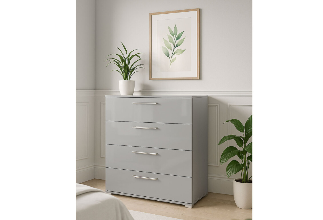 Комод МироМарк Меги / Megy с 4 ящиками — это идеальное решение для тех, кто ценит функциональность и стиль в интерьере. С шириной 100 см, высотой 106,1 см и глубиной 40 см, этот комод станет не только практичным, но и эстетически привлекательным элементом вашей спальни. Выполненный в современном минималистичном стиле, он обладает глянцевым серым цветом шиншиллы, который гармонично впишется в любой интерьер. Комод оснащен четырьмя ящиками, что обеспечивает достаточное пространство для хранения ваших вещей. Металлические ручки и телескопические направляющие полного выдвижения гарантируют легкость в использовании и долговечность. Корпус из ламинированной ДСП и фасад из глянцевой ДСП обеспечивают надежность и устойчивость к внешним воздействиям.