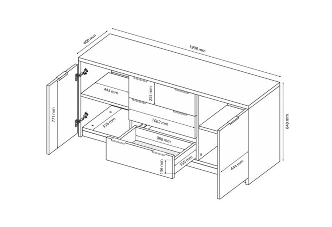 Комод оснащён двумя дверками и тремя ящиками, что обеспечивает достаточное пространство для хранения ваших вещей. Алюминиевые ручки добавляют современный штрих и удобство в использовании. Телескопические направляющие полного выдвижения обеспечивают лёгкость открытия и закрытия ящиков, что делает процесс использования комода комфортным и приятным.
