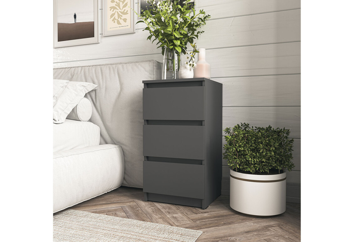 Комод оснащен тремя ящиками, которые обеспечивают достаточное пространство для хранения вещей. Благодаря телескопическим направляющим полного выдвижения, вы сможете легко и удобно открывать ящики, не беспокоясь о заедании. Отсутствие ручек придает комоду современный и стильный вид, что идеально вписывается в концепцию минимализма. Цвет антрацит добавляет строгости и элегантности, делая комод универсальным элементом, который легко сочетать с другими предметами мебели.