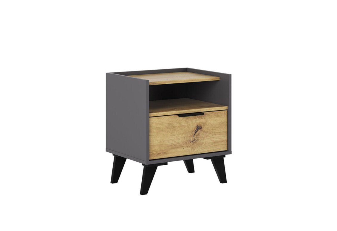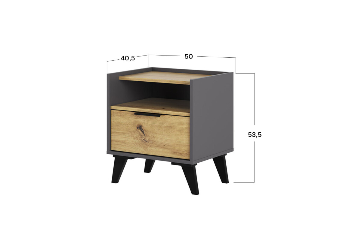 Прикроватная тумба Svit Mebliv Камила — это идеальное решение для вашей спальни, сочетающее в себе современный стиль и практичность. С шириной всего 50 см, она отлично впишется в любое пространство, обеспечивая при этом достаточное место для хранения необходимых мелочей. Одним из ключевых преимуществ этой тумбы является наличие одного ящика и открытой полки, что позволяет удобно организовать ваши вещи и поддерживать порядок. Изготовленная из высококачественной ДСП, тумба отличается прочностью и долговечностью, а цвет дуб артизан в сочетании с графитом придаёт ей современный и стильный вид, который легко впишется в любой интерьер.