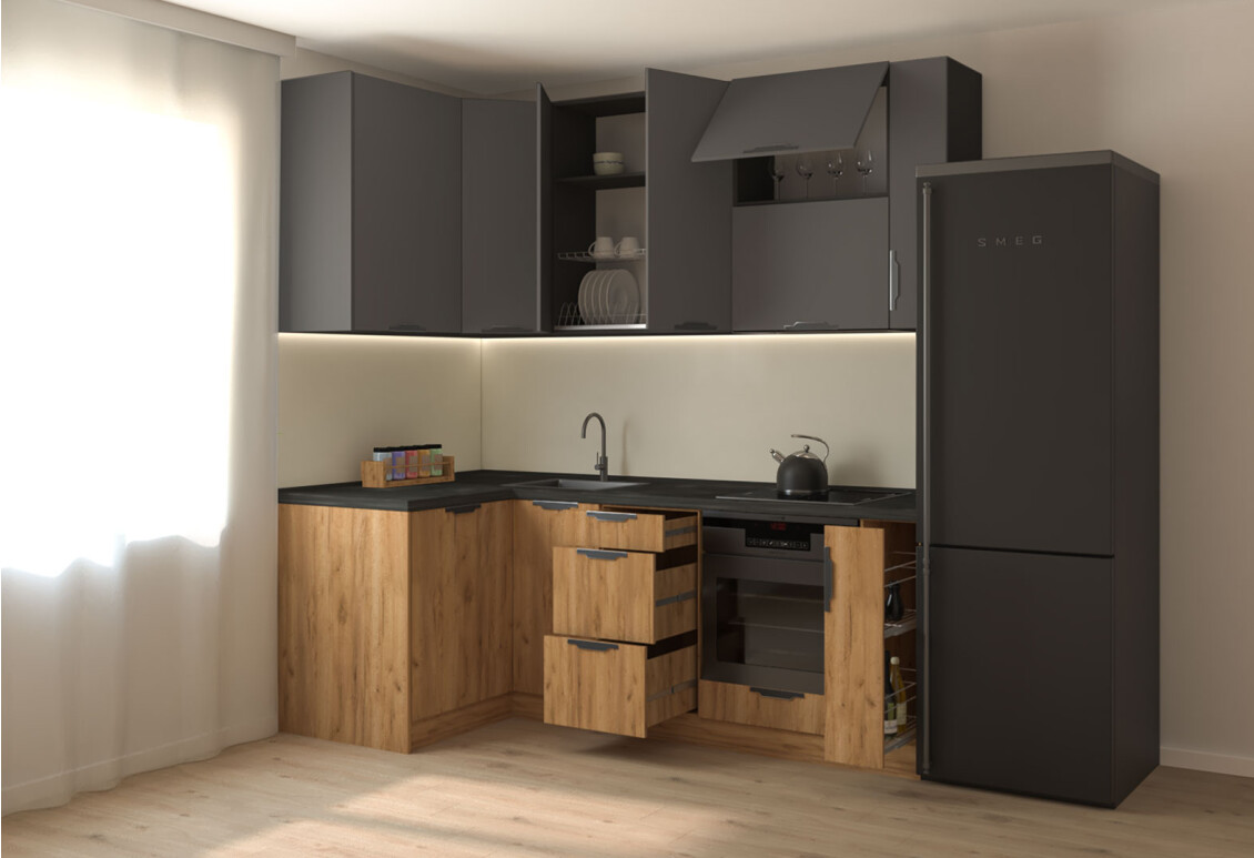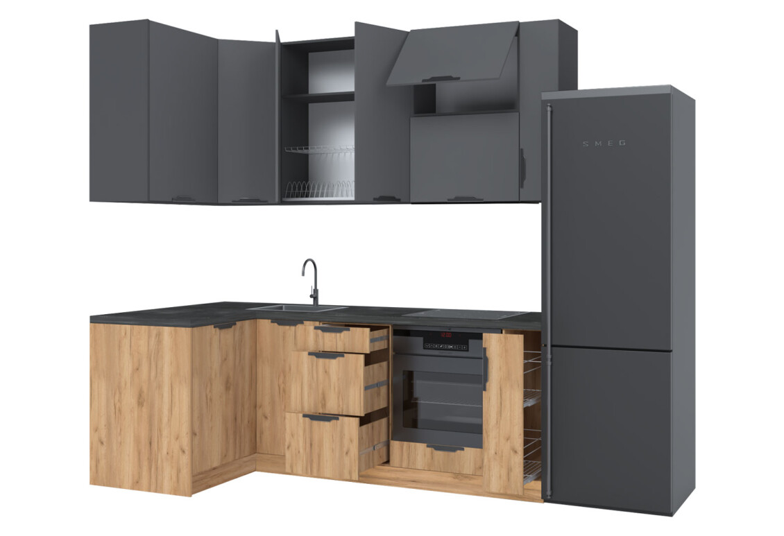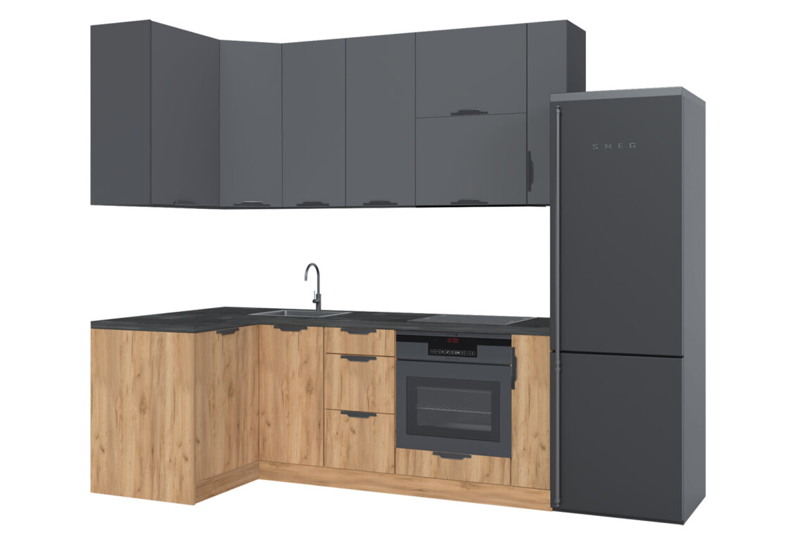 Характеристики товара Кухня угловая MiroMark Лео / Leo 1.22х2.2 м, графит / дуб крафт золотой