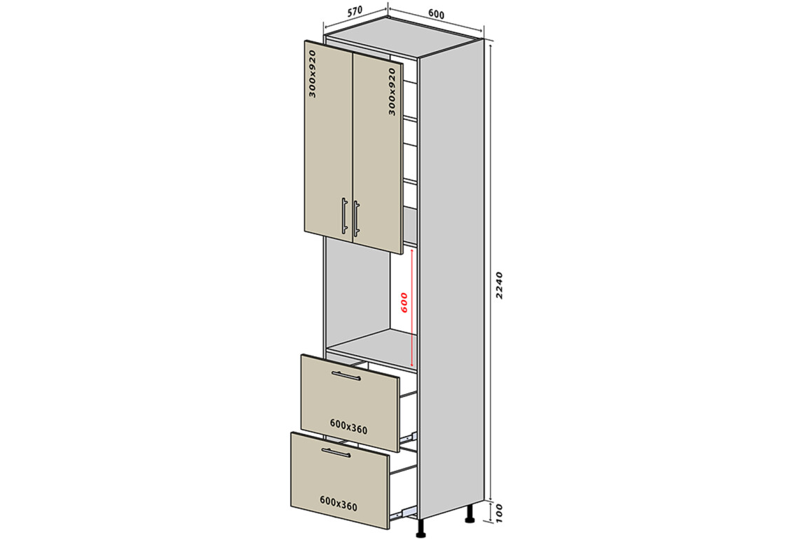 Пенал Н21 2Д2Ш 234 New Марго Люкс от производителя VIP-master – это идеальное решение для организации пространства вашей кухни. Высота 234 см и ширина 60 см делают его достаточно вместительным, при этом он не занимает много места. Этот пенал выполнен из качественных материалов: корпус изготовлен из ламинированной ДСП, а фасад – из крашеной МДФ, что обеспечивает долговечность и надежность. Вы можете выбрать подходящий цвет корпуса из множества доступных вариантов, таких как венге, дуб молочный, серый и многие другие, а также разнообразные текстуры фасада – от денима до бархата. Таким образом, вы сможете легко вписать пенал в любой интерьер, подчеркнув его индивидуальность.