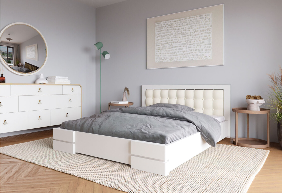 Кровать Arbor Drev Регина Люкс доступна в различных модификациях, что позволяет каждому покупателю выбрать наиболее подходящий вариант. Вы можете выбрать спальный размер: 160х200, 180х200 или 140х200 см, а также цветовое оформление: белый / Лагуна 03, орех / Лагуна 07 или тёмный орех / Лагуна 11. Кроме того, можно выбрать вид дерева: сосна или бук. Это делает кровать универсальным решением, подходящим для любого стиля интерьера.