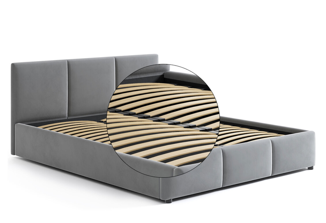 - Материал обивки: полностью обитая, что придаёт кровати стильный и аккуратный вид