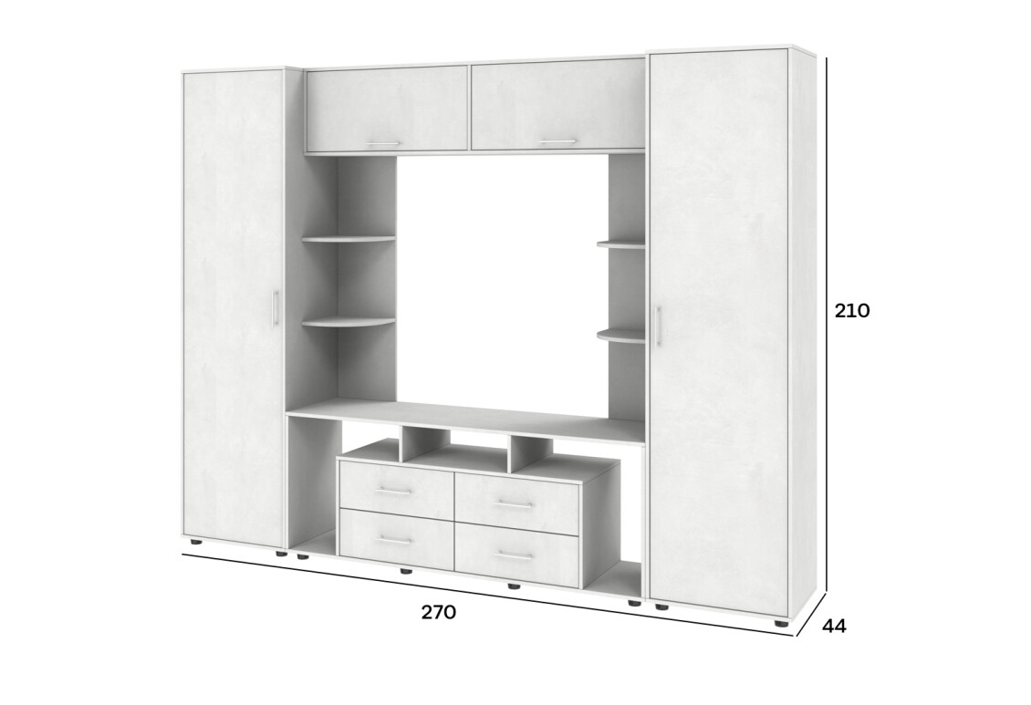 Стенка Киевский стандарт Юта – это идеальное решение для вашей гостиной, которое объединяет в себе функциональность, современный стиль и высокое качество. С шириной 270 см, высотой 210 см и глубиной 44 см, эта стенка прекрасно впишется в любое пространство, обеспечивая достаточное место для размещения телевизора и других медиа-устройств. Изготовленная из ламинированной ДСП, она гарантирует долговечность и устойчивость к повреждениям, что делает её отличным выбором для активного использования в доме. Металлические ручки добавляют нотку современности и удобства, а стильный цвет бетон стайл придаёт стенке элегантный и актуальный вид.