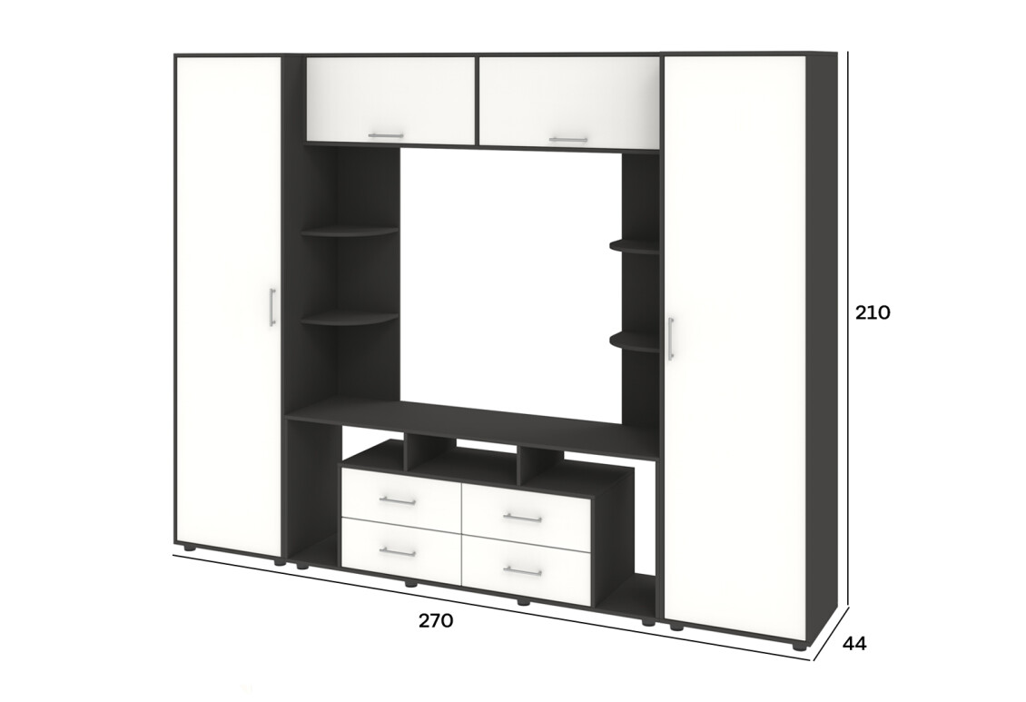 Стенка Киевский стандарт Юта М 270 см – это идеальное решение для вашей гостиной, которое сочетает в себе современный стиль и практичность. Эта стенка станет не только функциональным элементом интерьера, но и стильным акцентом, который подчеркнёт вашу индивидуальность. С размерами 270 см в ширину, 210 см в высоту и 44 см в глубину, она отлично впишется в любое пространство, создавая уют и комфорт. Стенка предназначена для установки телевизора, что делает её идеальным выбором для тех, кто ценит комфортный просмотр любимых фильмов и передач. Стенка выполнена из качественных материалов: корпус из ламинированной ДСП обеспечивает надёжность и долговечность, а фасад из МДФ придаёт изделию стильный и современный вид. Металлические ручки добавляют практичности и эстетичности, подчеркивая общий дизайн. Кроме того, данная модель доступна в нескольких цветовых вариантах, что позволяет выбрать наиболее подходящий для вашего интерьера: антрацит / белый, нимфея альба / слоновая кость, дуб леворно / черный. Благодаря этому, вы сможете легко интегрировать стенку в любое оформление вашего дома.