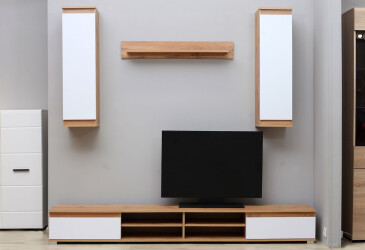 Стенка доступна в различных модификациях, что дает вам возможность выбрать идеальный вариант для вашего дома. Вы можете выбрать цвет нимфея альба, сочетание нимфея альба и бетона, а также дуб тахо с нимфея альба, что позволяет легко адаптировать стенку под ваш интерьер.