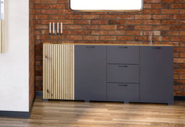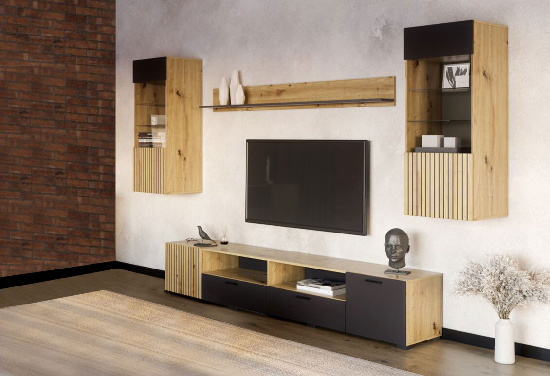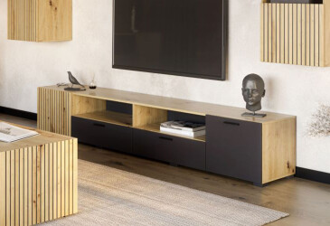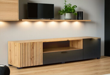 - Тумба под ТВ Svit Mebliv Зара 230 см с полками и ящиками, дуб артизан / антрацит, 1 шт – 230.00 см x 42.50 см x 42.00 см