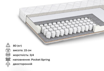 - Наполнение матраса: термофайбер, кокос, oxigenfoam, пружины Pocket spring, хлопок, шерсть, прошивка чехла "Зима/Лето"