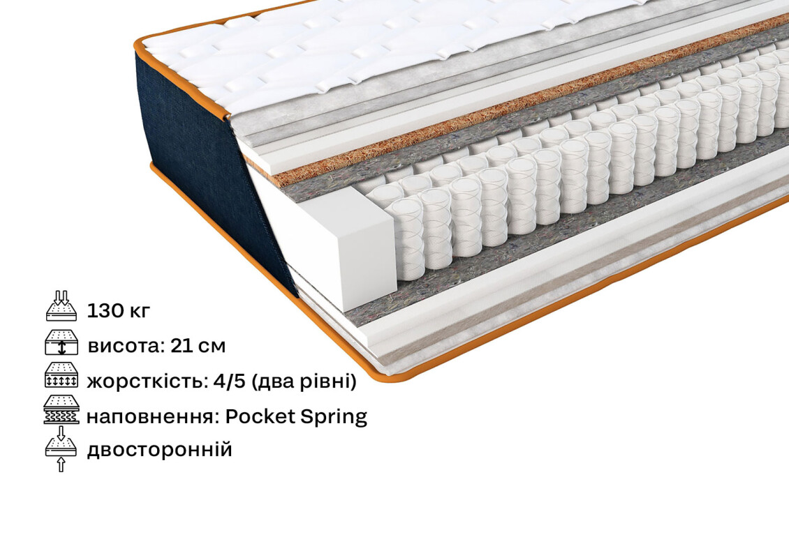 - наполнение матраса: кокос, войлок, пружины Pocket spring, хлопок, шерсть, пена, спанбонд, синтепон, прошивка чехла "Зима/Лето"
