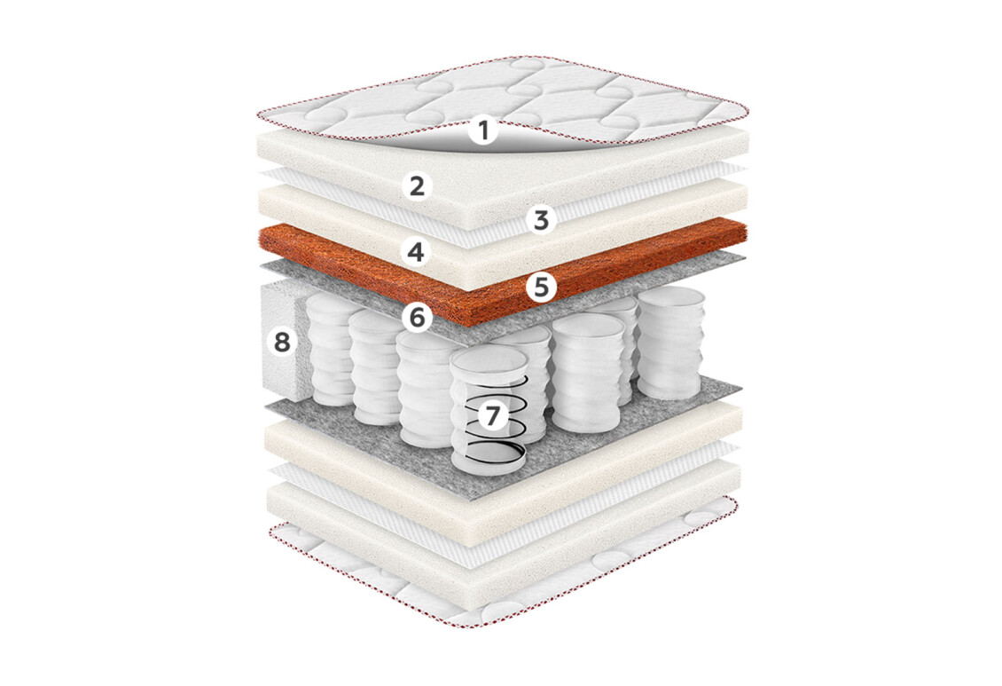 - Наполнение матраса: евроборт с пены по периметру, латексированный кокос, пена, термовойлок, пружины Pocket Hard
