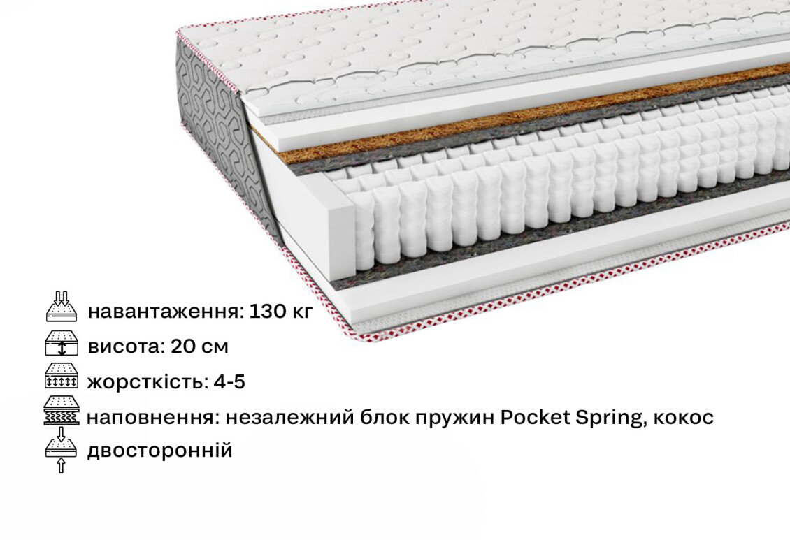 - Наполнение матраса: евроборт с пены по периметру, латексированный кокос, пружины Pocket spring, пена, термовойлок