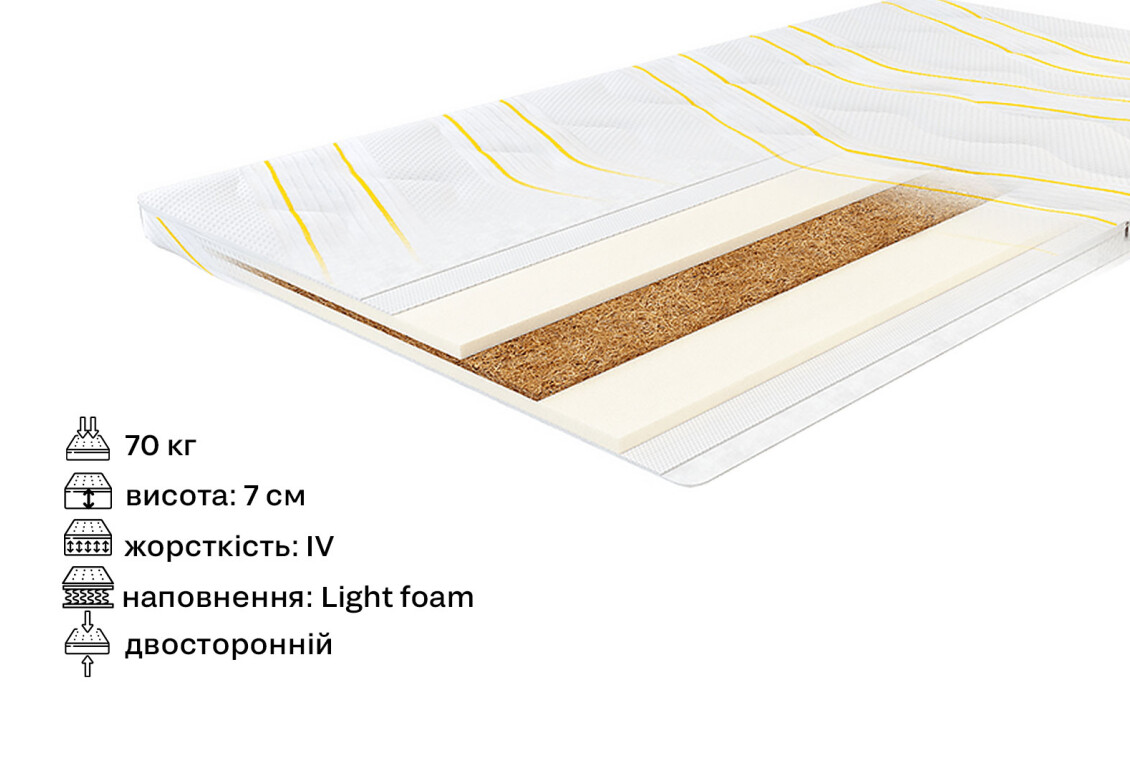 - Наполнение матраса: кокос, спанбонд, синтепон, пена