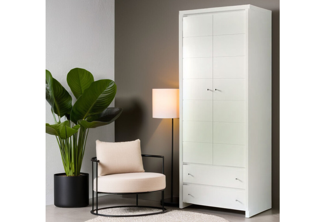 Шкаф ВМК Кристина 2-дверная с 2 ящиками — это идеальное решение для тех, кто ценит практичность и стиль в интерьере. С шириной 90 см, высотой 200,5 см и глубиной 55,5 см, этот шкаф отлично впишется в любое помещение, обеспечивая достаточно места для хранения одежды и других вещей. Изготовленный из ламинированной ДСП, он отличается прочностью и долговечностью, а белый цвет и минималистичный стиль делают его универсальным элементом для любого интерьера. Металлические ручки добавляют шкафу современный акцент и удобство в использовании. Выбирая шкаф ВМК Кристина, вы получаете надежный и функциональный предмет мебели по выгодной цене, который станет прекрасным дополнением вашего дома.