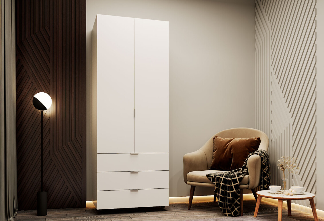 Шкаф Doros Гелар 2 ДСП – это идеальное решение для тех, кто ценит функциональность и надежность в интерьере. Этот двухдверный шкаф с тремя ящиками не только эффектно впишется в любой интерьер, но и обеспечит достаточное пространство для хранения одежды и других вещей. Его размеры – ширина 77.50 см, высота 203.40 см и глубина 49.50 см – делают его универсальным выбором для различных помещений, будь то спальня, прихожая или кабинет. Изготовленный из ламинированной ДСП, этот шкаф отличается прочностью и долговечностью, а его белый цвет придаст помещению свежесть и легкость. Пластиковые ручки и роликовые направляющие обеспечивают комфортное открытие и закрытие дверей и ящиков, что делает использование шкафа максимально удобным.
