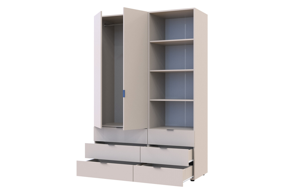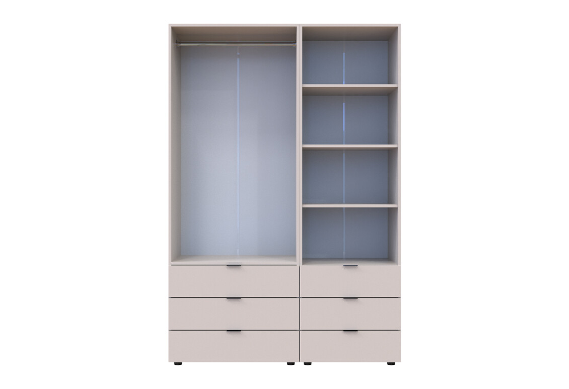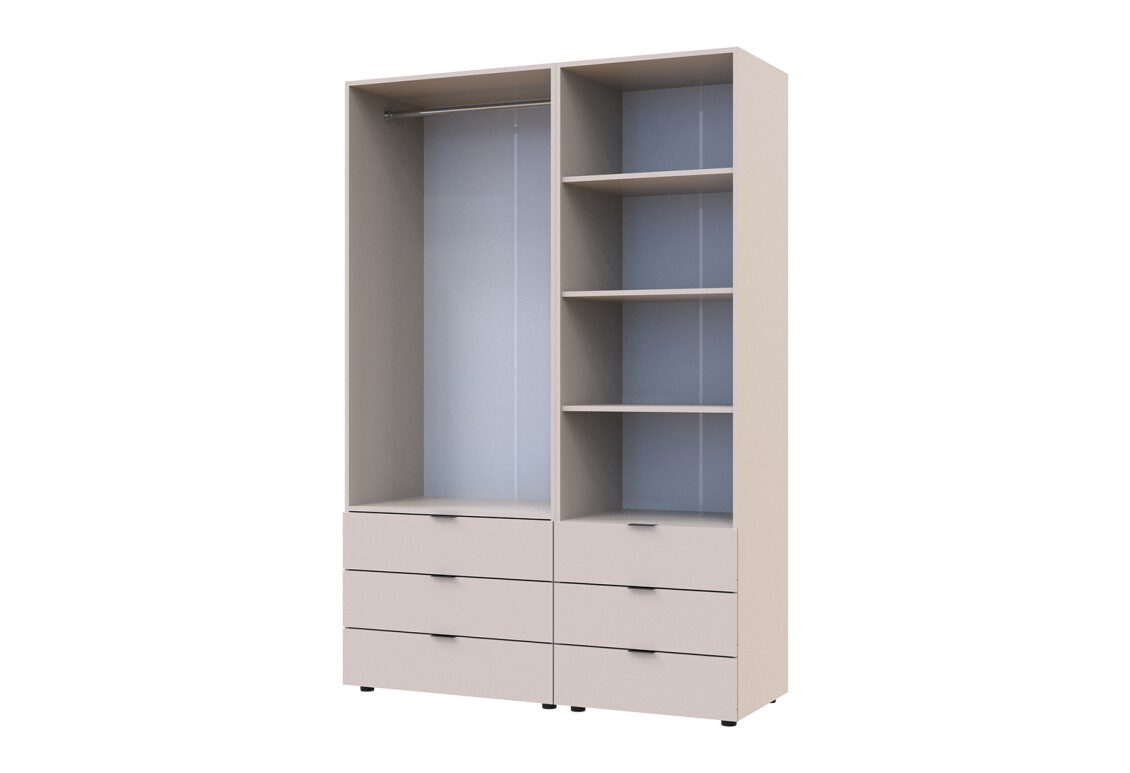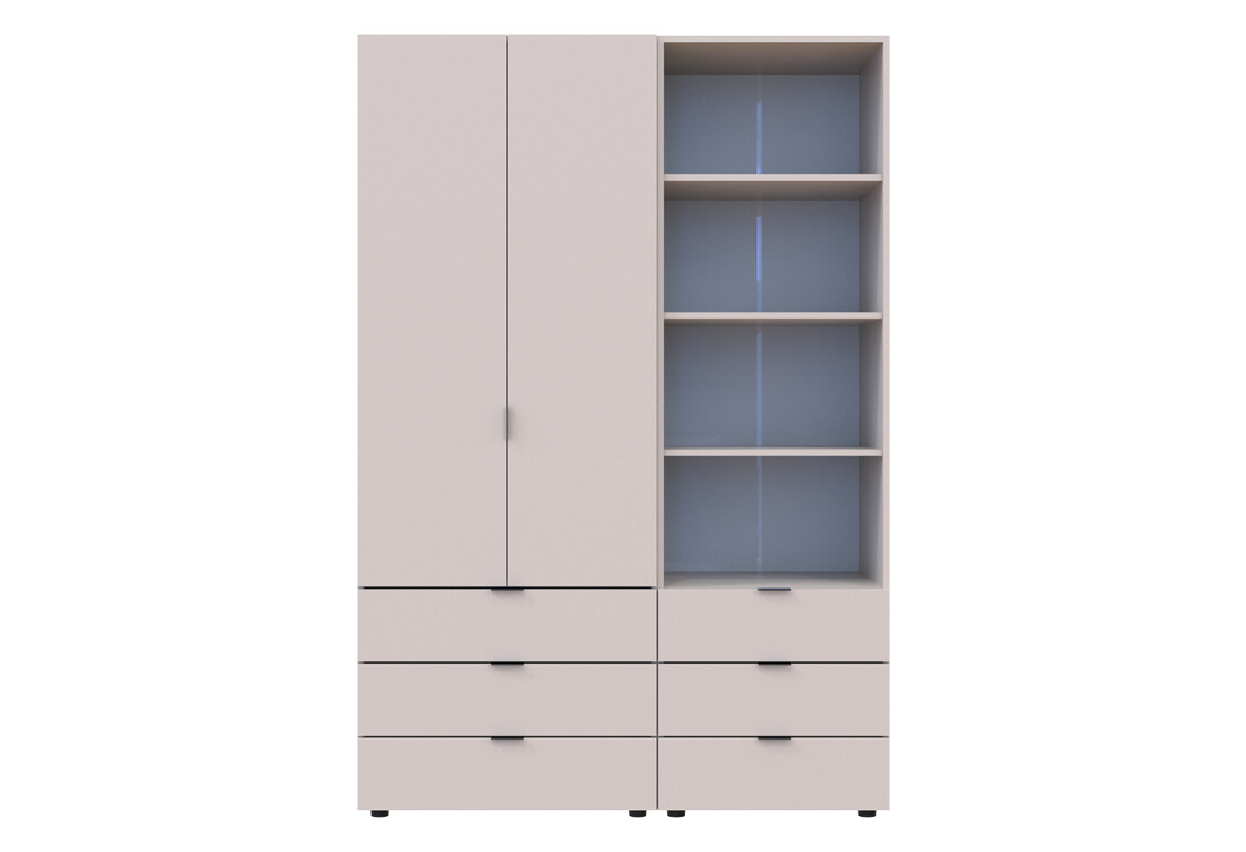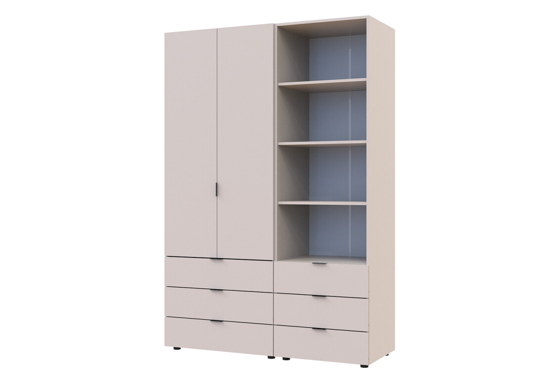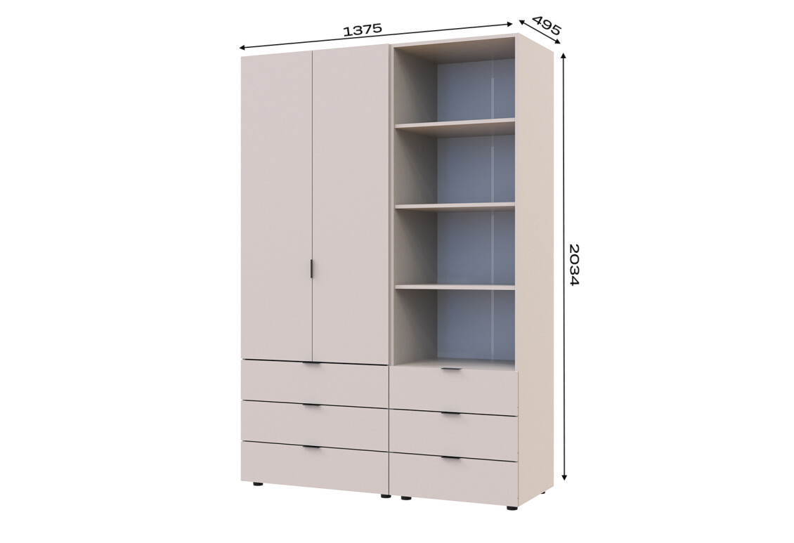 Характеристики товара Шкаф Doros Гелар 2 ДСП 2-дверная с ящиками и пеналом с открытыми полками 137.5 см Кашемир