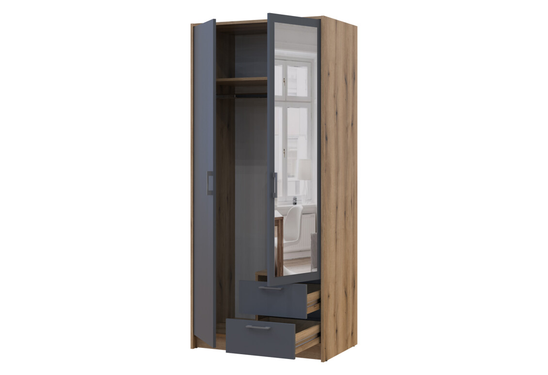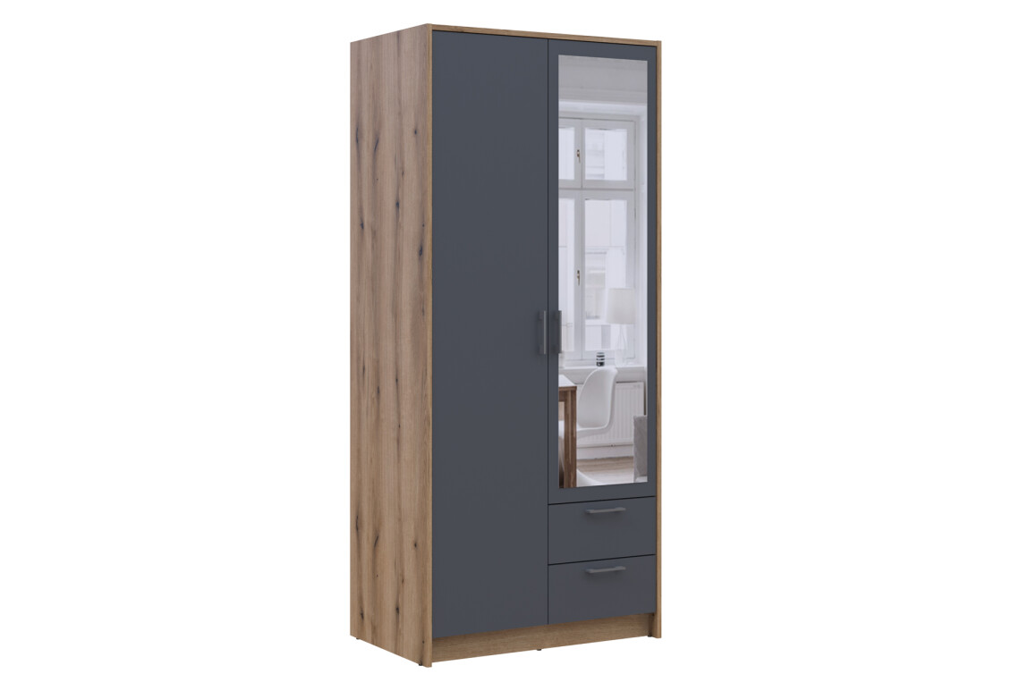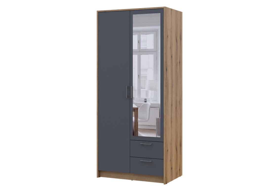 Шкаф Doros Ронди – это идеальное решение для тех, кто ценит функциональность и стиль в интерьере. С шириной 82 см, высотой 195 см и глубиной 52 см, этот 2-дверный шкаф с зеркалом и двумя ящиками идеально впишется в любую спальню или прихожую. Его современный дизайн в стиле минимализма и сочетание цветов дуб артизан и графит придают ему элегантный вид, который легко комбинировать с другими предметами мебели. Изготовленный из качественной ламинированной ДСП, шкаф обеспечивает надежность и долговечность, а его наполнение, состоящее из штанги и ящиков, позволяет удобно организовать пространство для хранения одежды и аксессуаров.