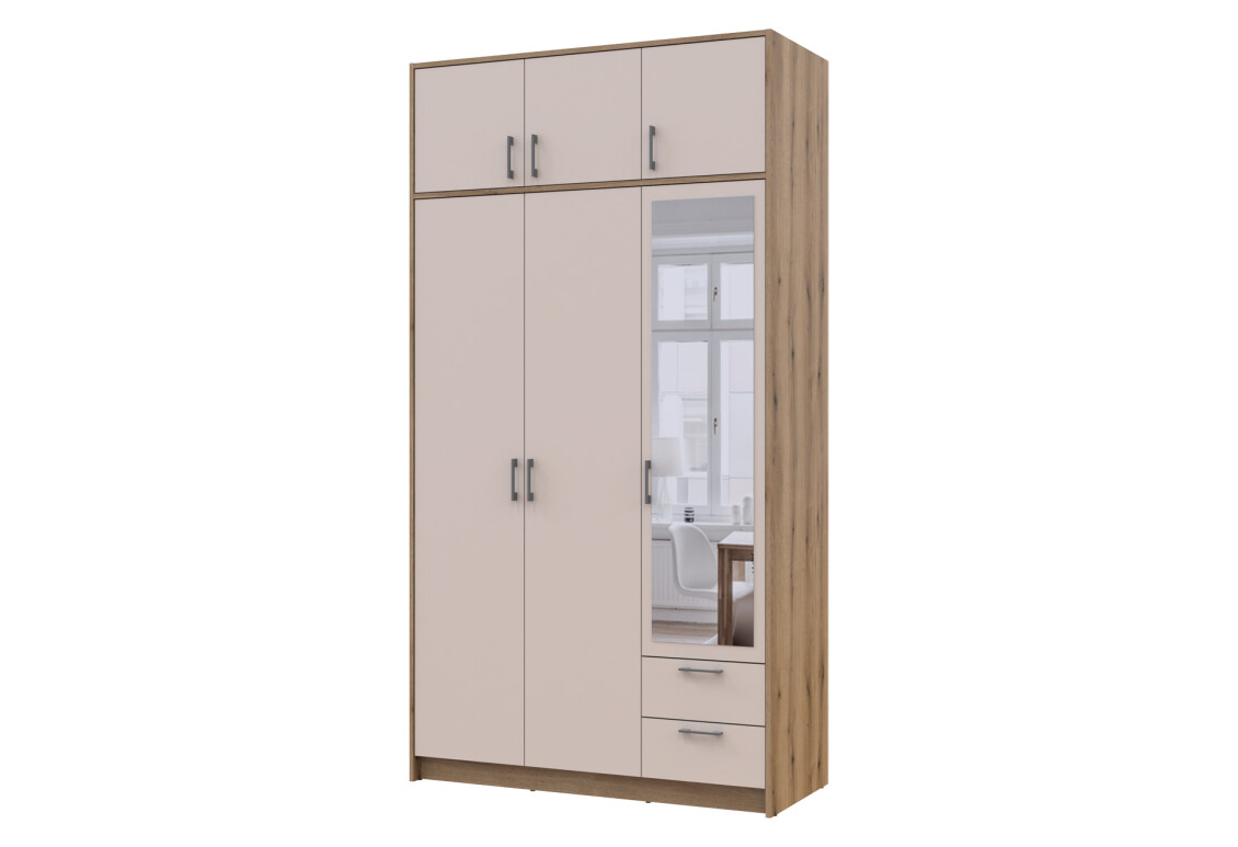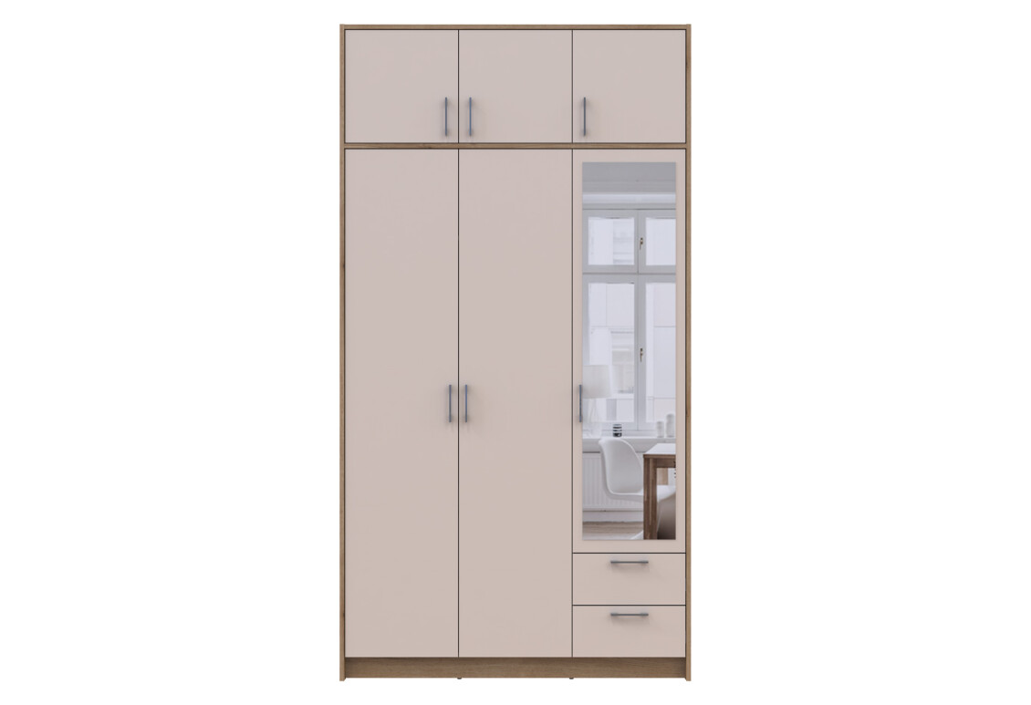 Характеристики товара Шкаф Doros Ронди 3-дверная с зеркалом, антресолей и 2 ящиками 121 см Дуб Артизан / Кашемир