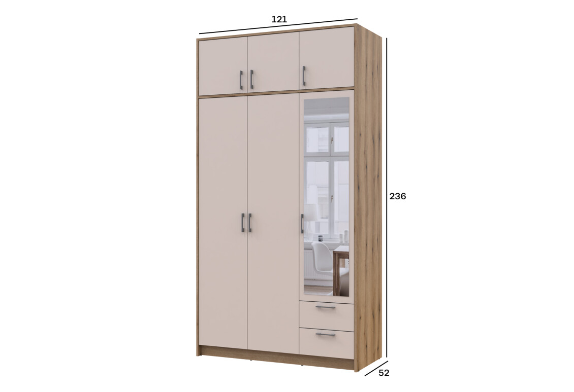 - Шкаф Doros Ронди 3-дверная с зеркалом и 2 ящиками 121 см Дуб Артизан / Кашемир, 1 шт – 121.00 см x 195.00 см x 52.00 см
