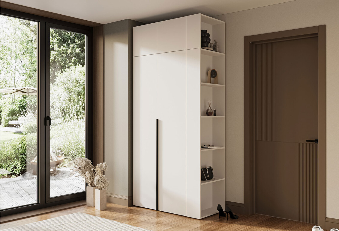 Шкаф доступен в нескольких модификациях, что дает возможность выбрать наиболее подходящий вариант под ваш интерьер. Вы можете выбрать шкаф в цвете нимфея альба, дуб артизан, графит, дуб артизан/нимфея альба, серая мышка или кашемир. Кроме того, доступно несколько вариантов наполнения корпуса: штанга и полки, полки или только штанга.