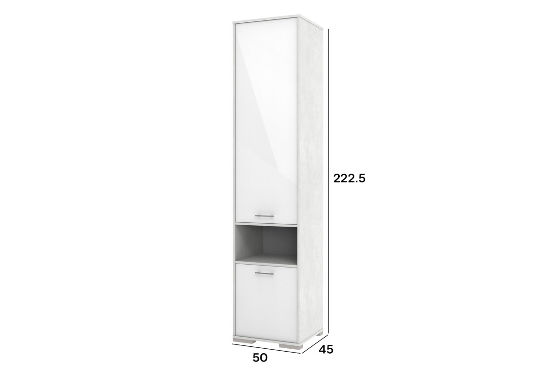 Шкаф Киевский стандарт Лира 2-дверная с нишей — это идеальное решение для тех, кто ценит современный стиль и функциональность в интерьере. Этот шкаф, выполненный в цвете бетон стайл с белым глянцем, отлично впишется в любой современный интерьер, добавляя ему нотки элегантности и утонченности. Его компактные размеры (ширина 50 см, высота 222,5 см, глубина 45 см) делают его подходящим для небольших помещений, а продуманное наполнение полками позволяет удобно разместить одежду и аксессуары. Металлические ручки придают шкафу дополнительную прочность и стильный вид, а качественные материалы, такие как МДФ для фасада и ламинированная ДСП для корпуса, обеспечивают долговечность и надежность в использовании.