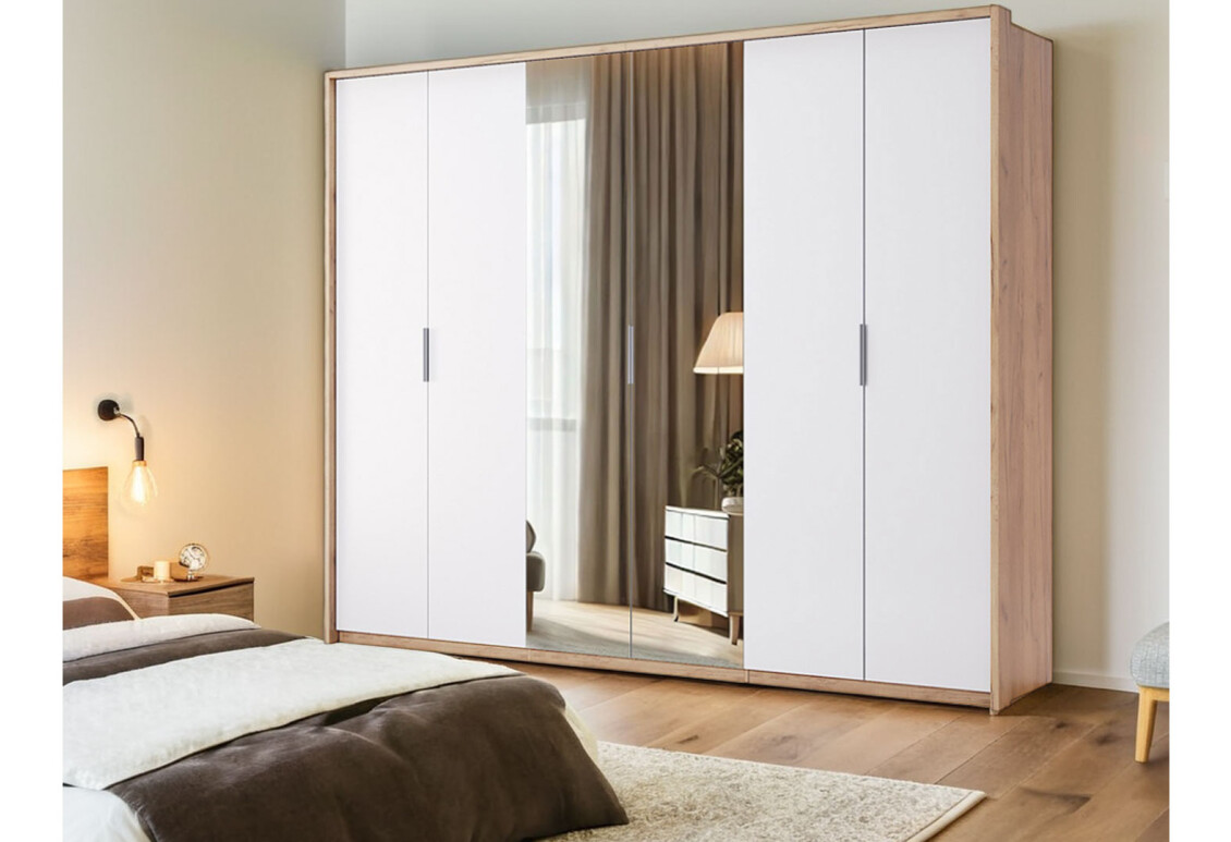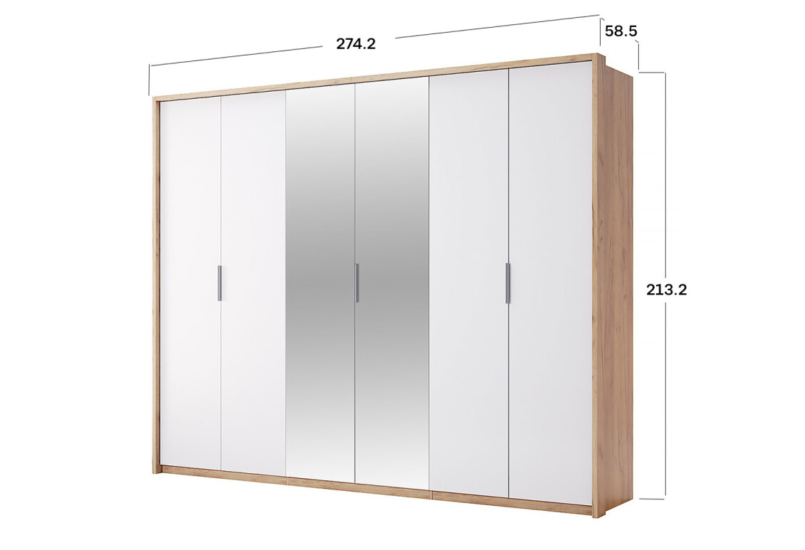 Шкаф МироМарк Асти 6-дверный с зеркалом - это идеальное решение для тех, кто ценит функциональность и стиль в интерьере. С шириной 274 см, высотой 213 см и глубиной 58,5 см, он предлагает достаточно пространства для хранения одежды и аксессуаров, а также добавляет визуальную легкость благодаря зеркалам. Этот шкаф выполнен в современном стиле, сочетая цвет дуба крафт и белый, что делает его универсальным элементом для любого интерьера. Изготовленный из качественной плиты, он обеспечивает надежность и долговечность, а металлические ручки добавляют элегантности и прочности. Гладкая глянцевая поверхность фасада из ДСП делает уборку легкой, а также создает эффектный визуальный акцент в вашем помещении.