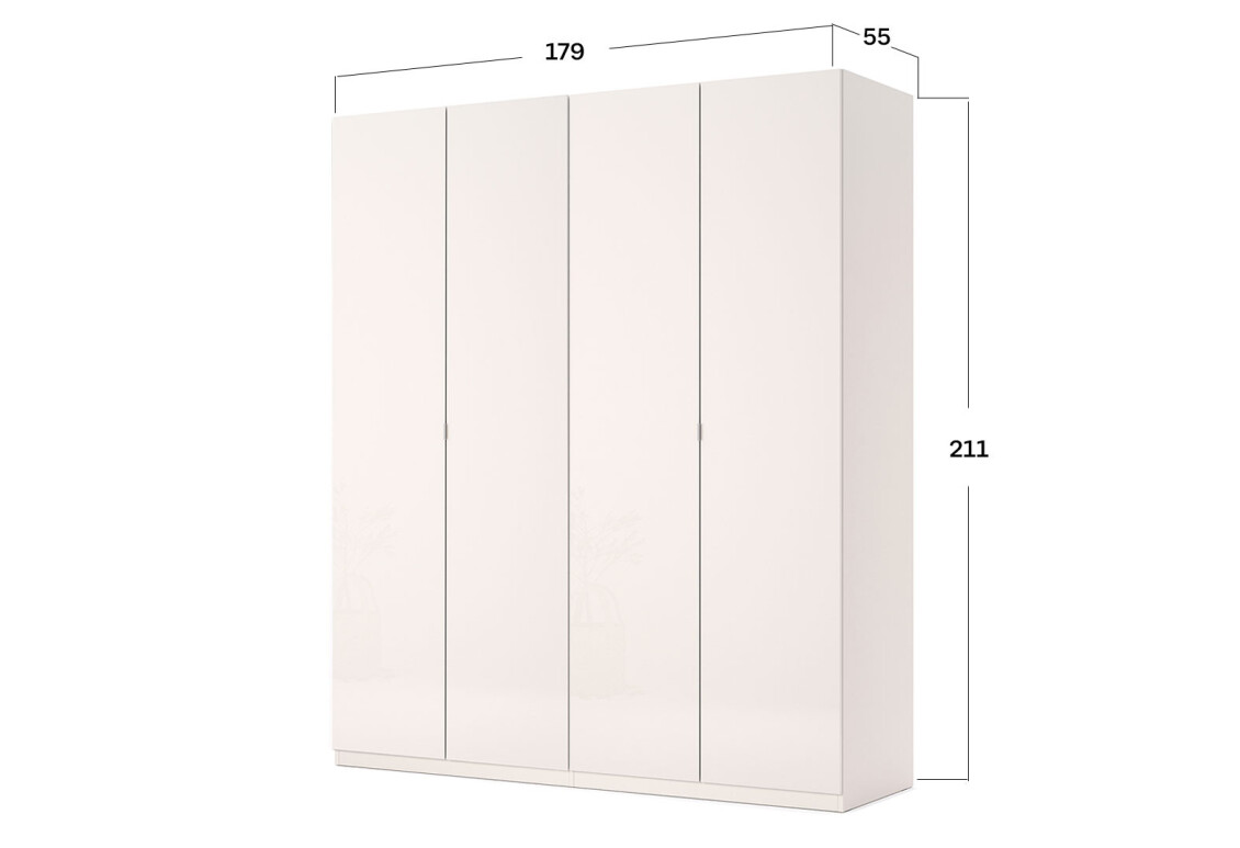 Шкаф МироМарк Лили / Lily 4-дверный – это идеальное решение для тех, кто ценит стиль и функциональность в интерьере. С шириной 179 см, высотой 210.6 см и глубиной 55 см, он прекрасно впишется в любое пространство, обеспечивая достаточное место для хранения одежды и аксессуаров. Гладкая поверхность фасада, выполненная из глянцевой ДСП в цвете кашемир, придаёт шкафу современный и элегантный вид, который легко сочетать с другими предметами мебели. Металлические ручки и петли с доводчиками гарантируют долговечность и удобство в использовании, что делает этот шкаф не только красивым, но и практичным выбором для вашей спальни.