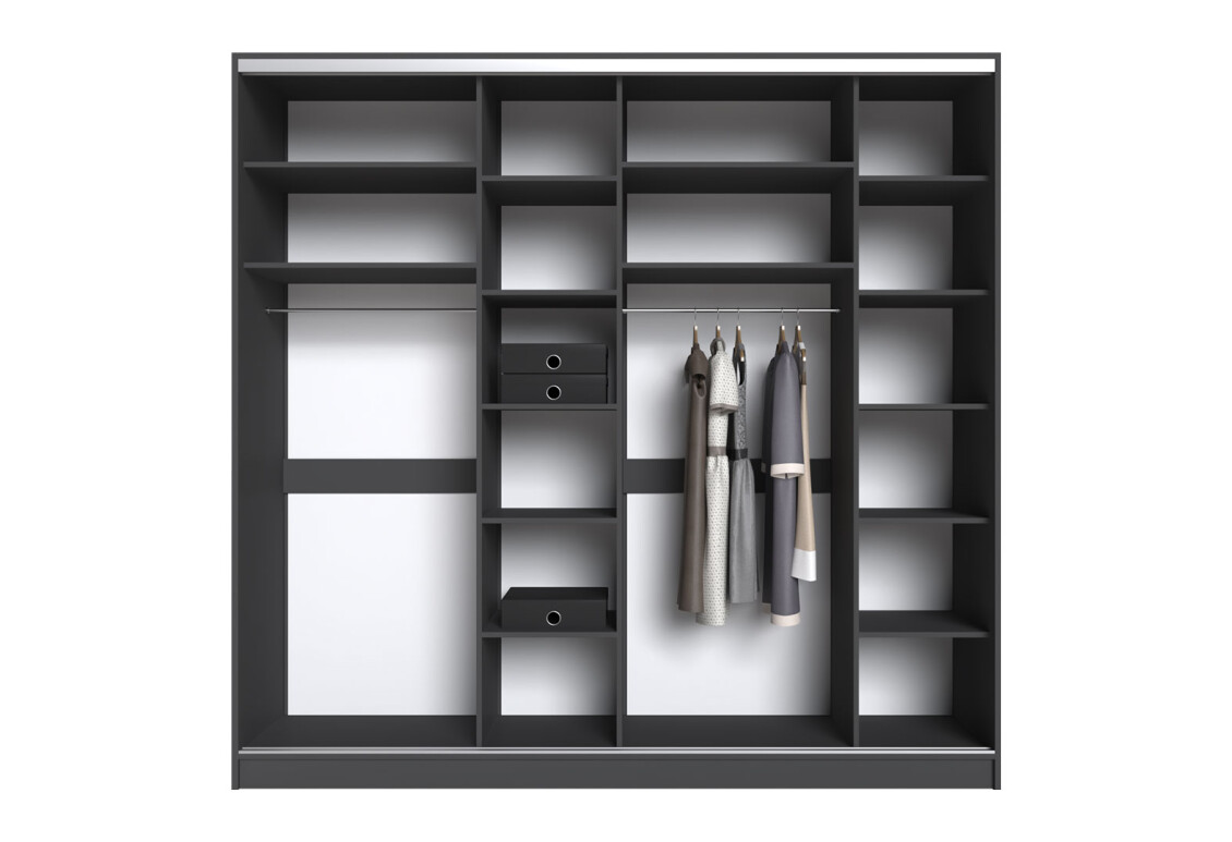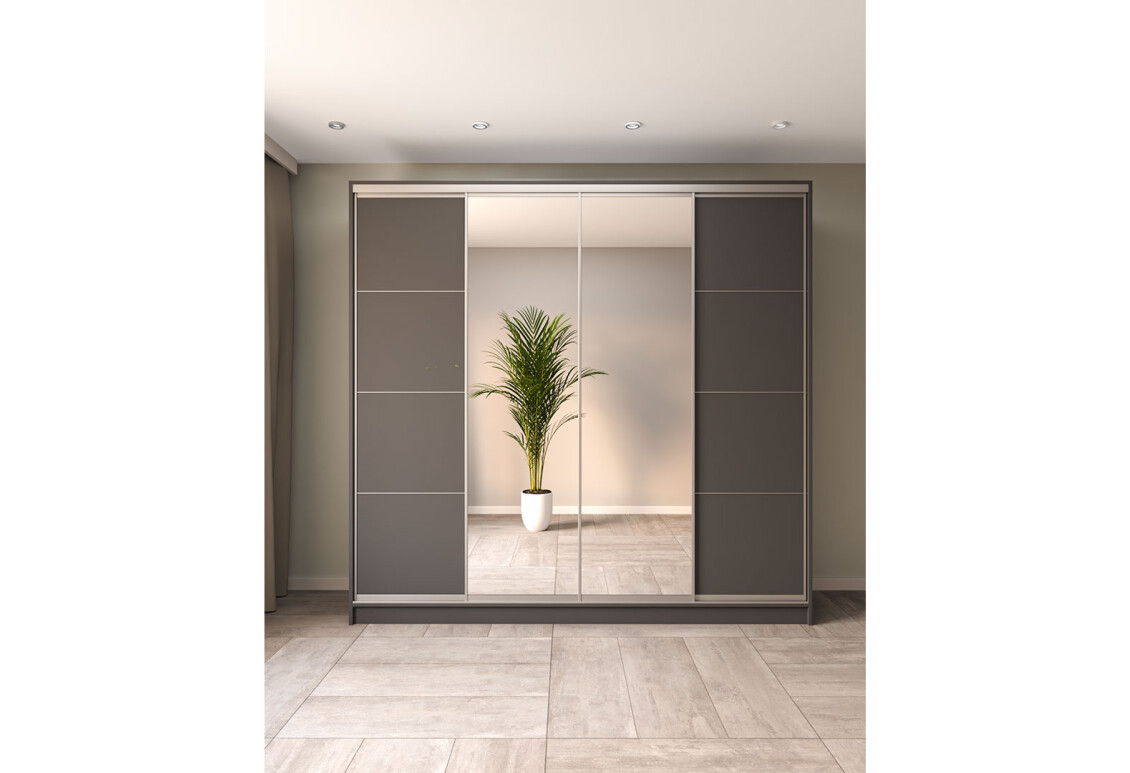 Шкаф-купе Киевский Стандарт 4Д 2500х2400х600 с зеркалом и фасадом Комб 7_7/9 ДСП в антрацитовом цвете — это идеальное решение для тех, кто ценит практичность и стиль в интерьере. Этот современный шкаф не только станет функциональным элементом вашего пространства, но и добавит элегантности благодаря зеркальным фасадам, которые визуально увеличивают пространство. Изготовленный из качественной ламинированной ДСП, он обеспечивает надежность и долговечность, что делает его отличным выбором для любого дома или квартиры. Размеры шкафа позволяют разместить в нем все необходимые вещи, а продуманное наполнение с штангой и полками поможет организовать пространство максимально эффективно.