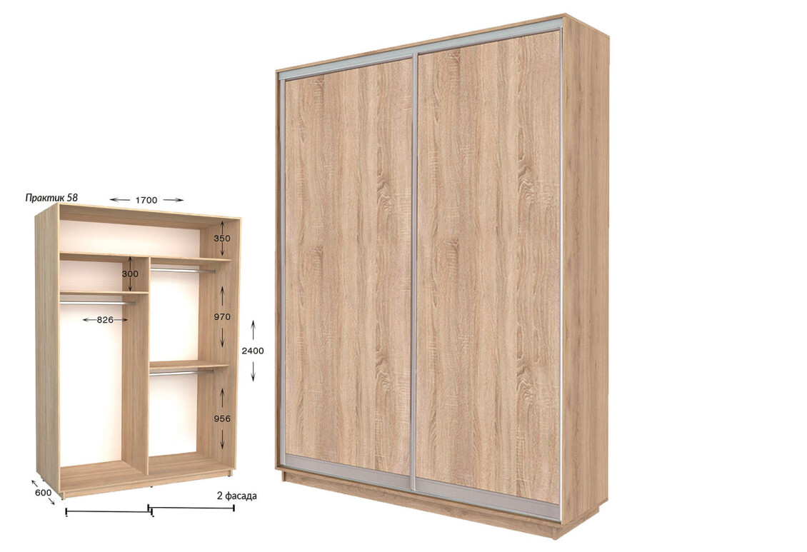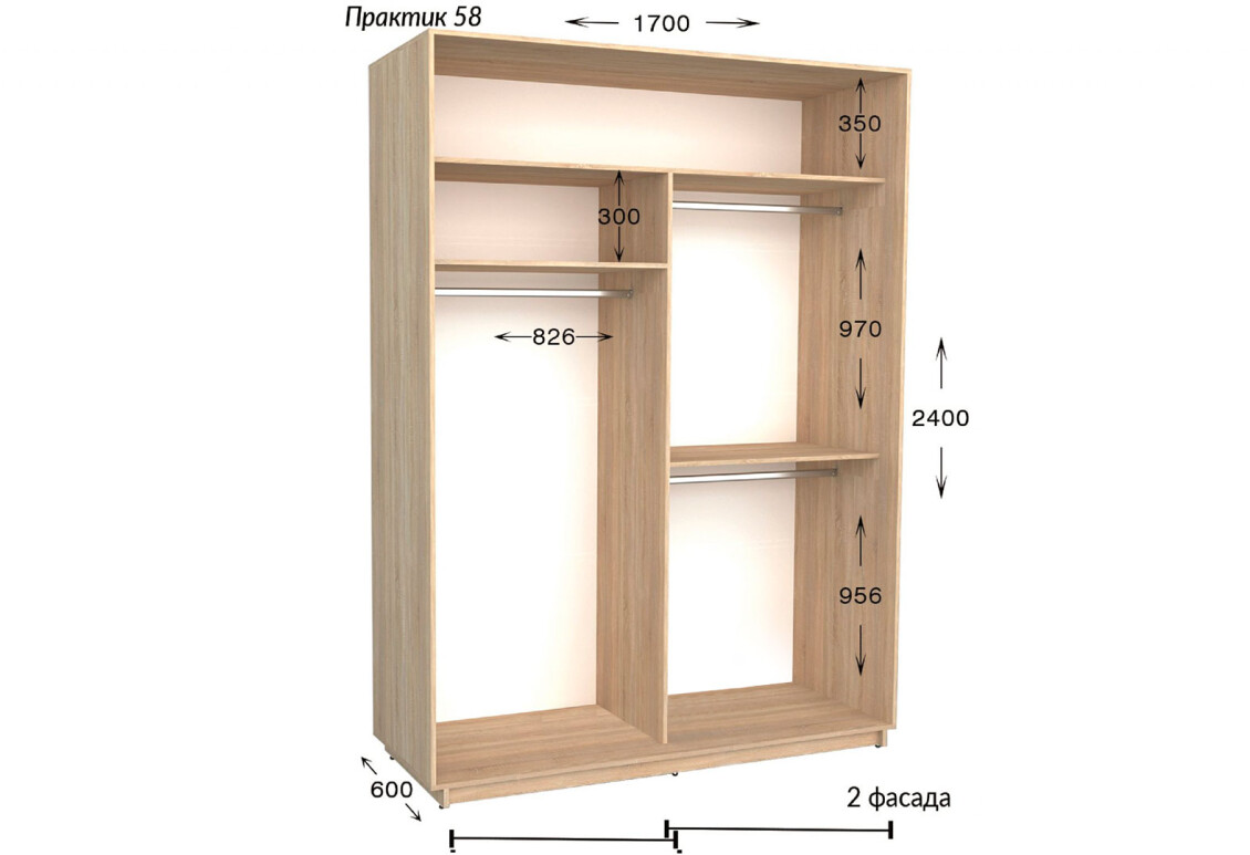 - Размер: ширина - 170 см, высота - 220 или 240 см, глубина - 450 или 600 мм