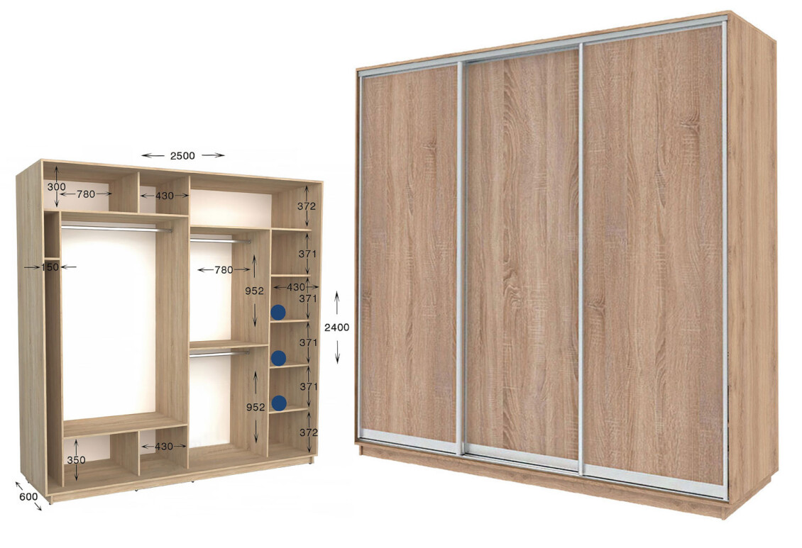 - Размер: ширина - 250.00 см, высота - 220 см или 240 см, глубина - 450 мм или 600 мм