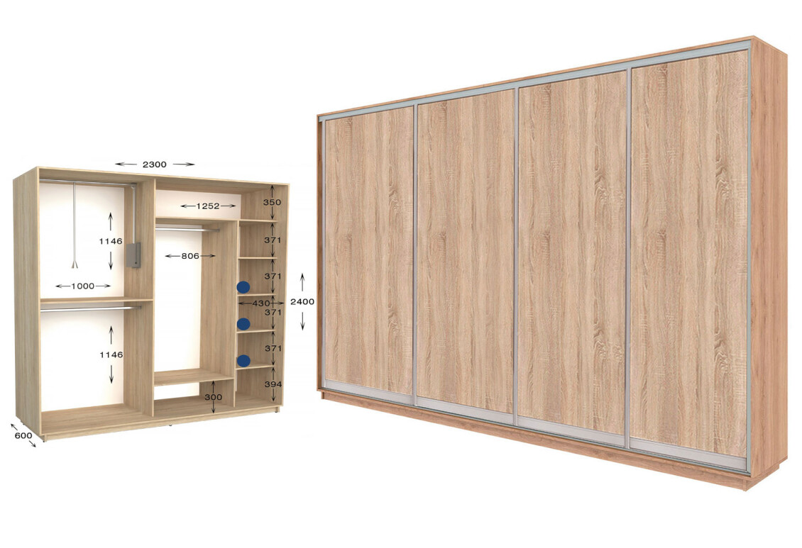 - Размер: ширина 230 см, высота 220 см или 240 см, глубина 450 мм или 600 мм
