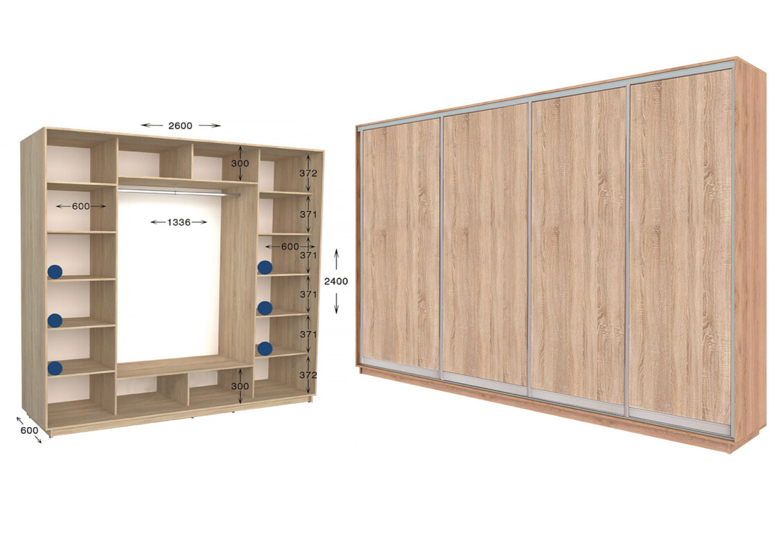 - Размер: ширина - 260.00 см, высота - 220 см или 240 см, глубина - 450 мм или 600 мм