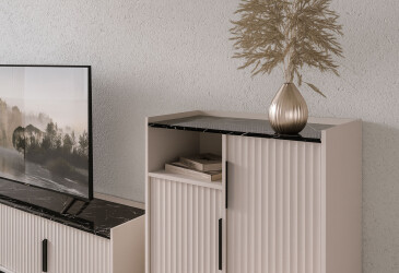 Витрина доступна в нескольких модификациях, что позволяет выбрать наиболее подходящий вариант для вашего интерьера: цвет кашемир / каштан арвадонная минк или кашемир / тёмный мрамор. Это дает возможность адаптировать мебель под ваши предпочтения и существующий стиль помещения.