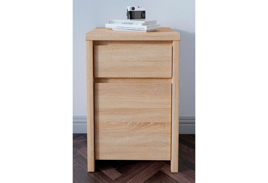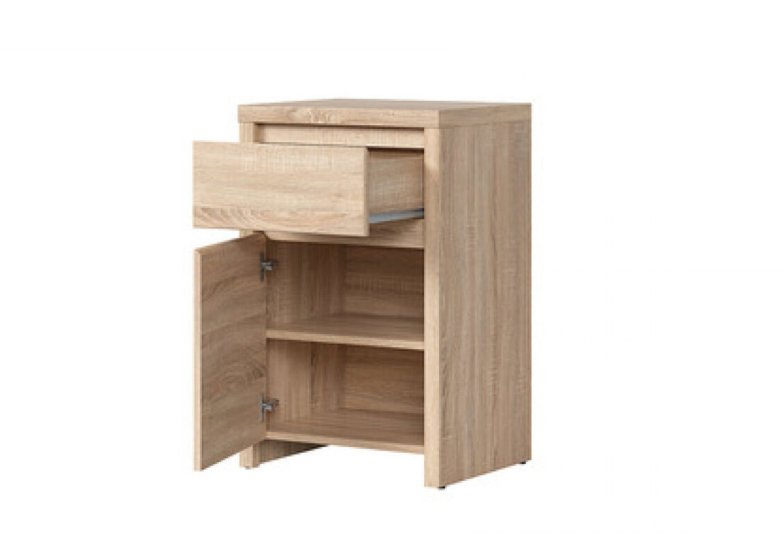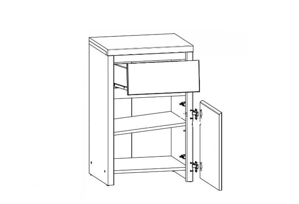 Комод оснащений одним дверцятом та шухлядою, що дозволяє зручно зберігати речі та підтримувати порядок. Відсутність ручок надає йому сучасного вигляду, а роликові напрямні забезпечують легкість відкривання та закривання. Це ідеальний вибір для тих, хто шукає практичні меблі за вигідною ціною.