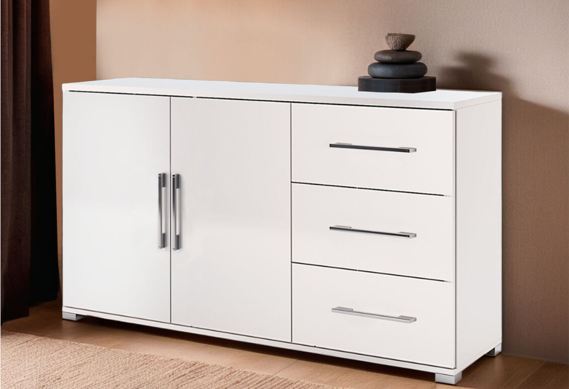 Комод MiroMark Фемілі 2-дверний з 3 шухлядами – це ідеальне рішення для тих, хто цінує практичність, стиль та надійність. Його компактні розміри (ширина 145.80 см, висота 82.30 см, глибина 40.00 см) роблять його універсальним доповненням до будь-якої кімнати, будь то спальня, вітальня чи дитяча. Виконаний з якісних матеріалів, таких як ламінована ДСП для корпусу та глянцева ДСП для фасаду, цей комод не лише виглядає естетично, але й забезпечує тривалий термін служби. Білий колір у стилі модерн додає легкості та свіжості інтер'єру, а металеві ручки підкреслюють його сучасний вигляд.