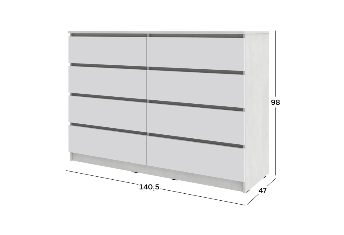 Комод Київський стандарт №16 з 8 шухлядами – це ідеальний вибір для тих, хто цінує практичність та функціональність у меблях. Його стильний дизайн у стилі модерн органічно впишеться в будь-який інтер'єр, додаючи йому сучасного вигляду. Завдяки своїм компактним розмірам (ширина 140.50 см, висота 98.00 см, глибина 47.00 см), комод стане чудовим рішенням для невеликих приміщень, де важливо зберегти простір. Цей комод виготовлений з ламінованої ДСП, що забезпечує йому високу міцність та довговічність. Відсутність ручок робить його зовнішній вигляд більш елегантним і сучасним, а телескопічні напрямні повного висуву забезпечують зручний доступ до всіх шухляд. Комод доступний у кількох кольорових варіантах, зокрема бетон стайл / німфея альба, антрацит / німфея альба, дуб ліворно та сіра лава / німфея альба, що дозволяє обрати найкращий варіант для вашого інтер'єру.