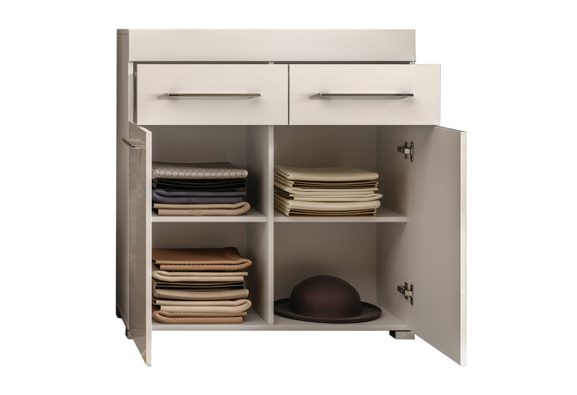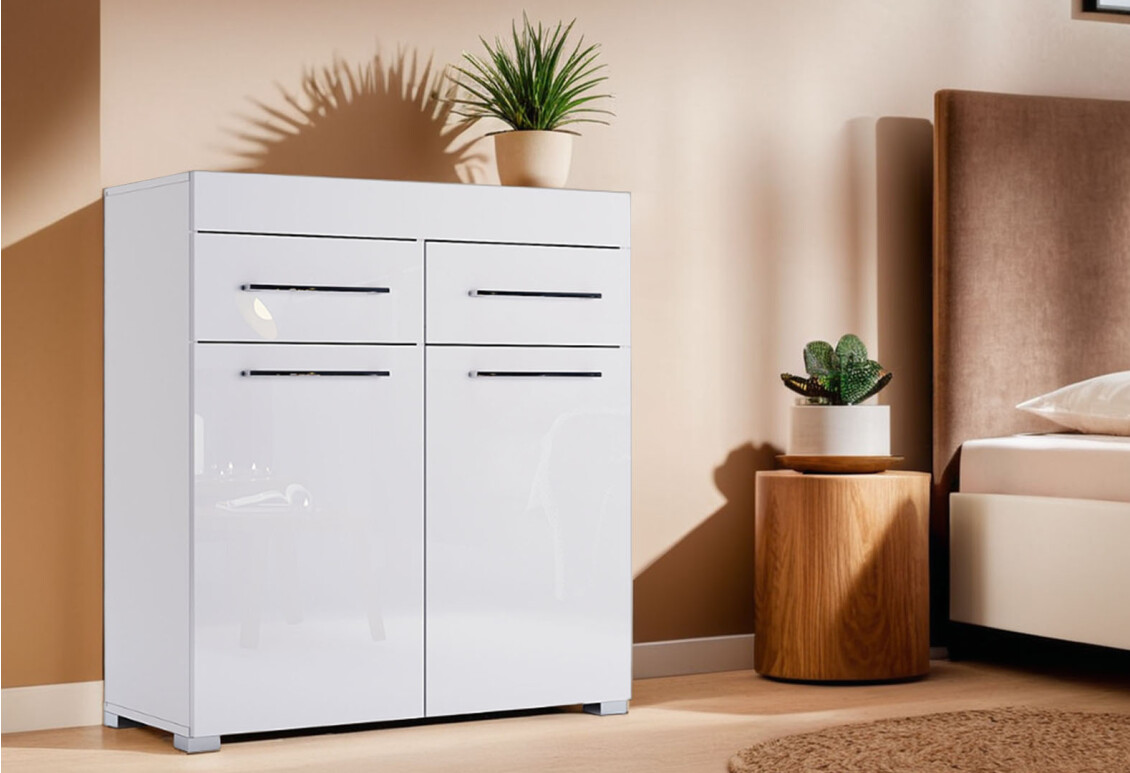 Комод MiroMark Аманда – це стильний і функціональний елемент меблів, який чудово впишеться в інтер'єр вашого дому. Його глянцевий білий фасад не лише надає елегантного вигляду, але й візуально розширює простір, що особливо важливо для невеликих кімнат. Завдяки компактним розмірам (ширина 90 см, висота 97 см, глибина 38 см), цей комод ідеально підходить для використання в передпокої, спальні або вітальні. Він оснащений двома дверцятами та двома шухлядами, що забезпечує достатньо місця для зберігання одягу, взуття та інших речей. Металеві ручки додають комоду сучасного вигляду, а телескопічні напрямні повного висуву забезпечують легкість у використанні та довговічність. Комод виконаний з якісної ламінованої ДСП, що гарантує надійність та стійкість до механічних пошкоджень.