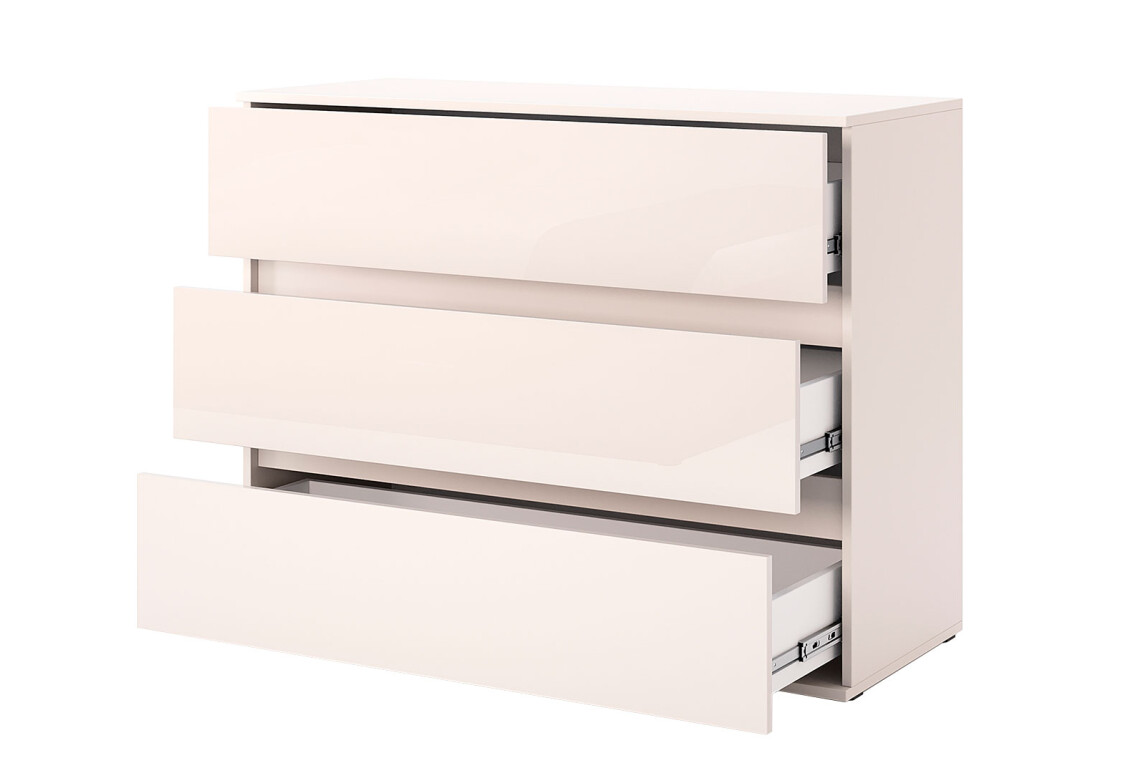 Комод MiroMark Лілі / Lily з 3 шухлядами — це стильний та функціональний елемент меблів, який ідеально впишеться в будь-який інтер'єр, виконаний у стилі мінімалізм. Завдяки своїм компактним розмірам (ширина 110 см, висота 85 см, глибина 45 см), цей комод не займе багато місця, але при цьому надасть достатньо простору для зберігання ваших речей. Глянцева поверхня в кольорі кашемір додає елегантності та сучасності, а відсутність ручок робить його вигляд ще більш стильним і лаконічним. Комод виготовлений з якісних матеріалів, що забезпечує його надійність і довговічність. Телескопічні напрямні повного висуву дозволяють з легкістю відкривати шухляди, що робить використання комоду комфортним.