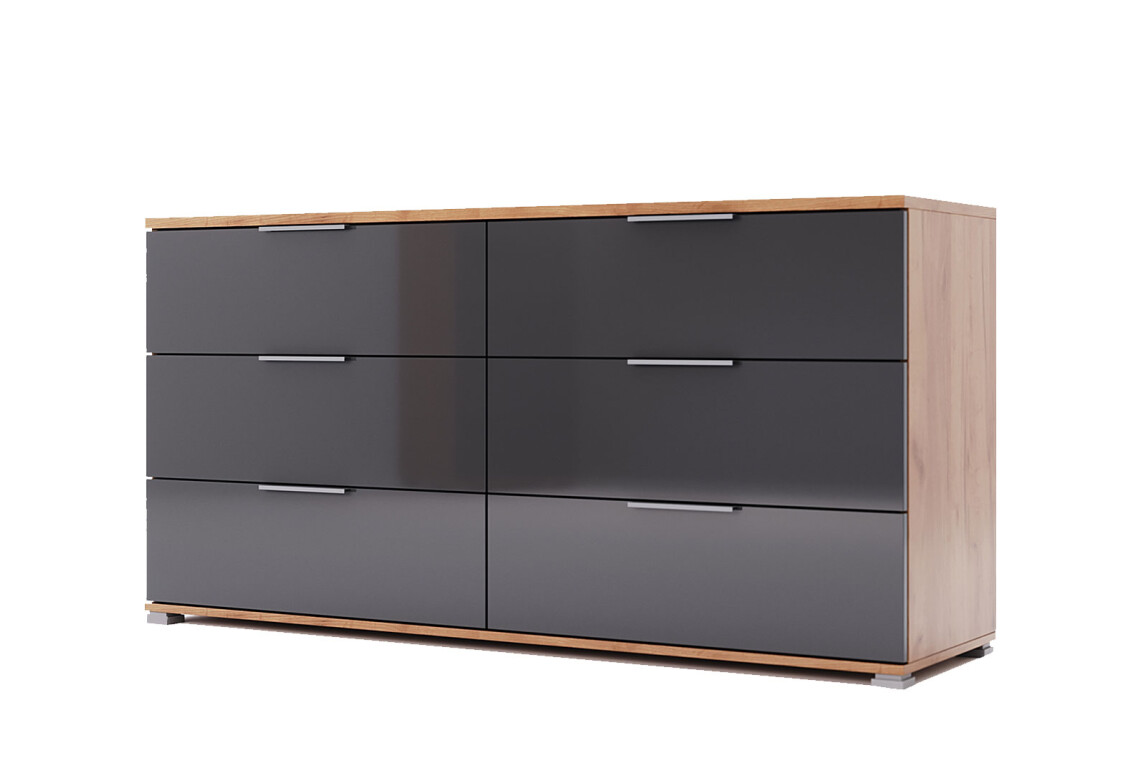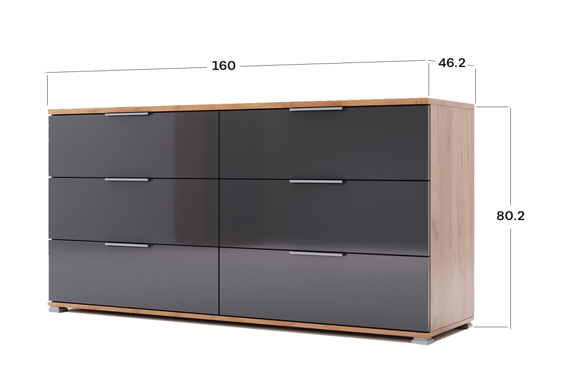 Комод MiroMark Рамона з 6 шухлядами – це ідеальне рішення для тих, хто цінує функціональність та стиль в інтер'єрі. Його розміри (ширина 160 см, висота 80,2 см, глибина 46,2 см) роблять його практичним елементом для будь-якої спальні чи вітальні. Комод виконаний у сучасному стилі, що підкреслює його елегантність та універсальність. Поєднання кольорів дуб крафт та лава надає йому привабливого вигляду, а глянцева ДСП фасаду додає естетичності. Металеві ручки забезпечують надійність та довговічність використання. Завдяки телескопічним напрямним повного висуву, шухляди легко відкриваються та закриваються, що робить користування комодом максимально зручним.