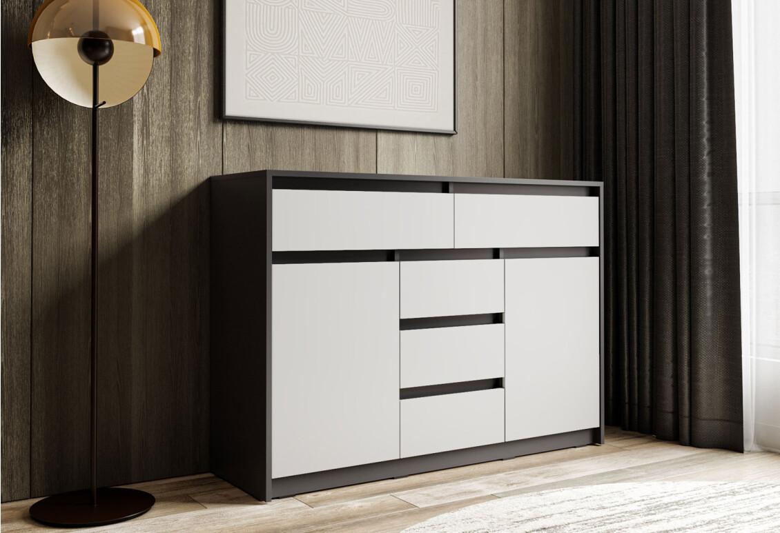 Комод Moreli Т227 – це сучасний та функціональний елемент меблів, який стане чудовим доповненням до вашого інтер'єру. Його розміри – 127 см у ширину, 91 см у висоту та 40 см у глибину – роблять його ідеальним для використання в різних приміщеннях, від спальні до вітальні. Комод виготовлений з ламінованої ДСП, що забезпечує високу міцність та довговічність, а також легкість у догляді. Завдяки поєднанню антрацитового та білого кольорів, він виглядає стильно та сучасно. Цей комод має 5 шухляд та дверцята, що дозволяє зручно зберігати різноманітні речі. Відсутність ручок надає йому елегантного вигляду, а телескопічні напрямні повного висуву забезпечують легкість у використанні. Важливо зазначити, що комод доступний у різноманітних кольорових модифікаціях, що дозволяє вам обрати варіант, який найкраще підійде до вашого інтер'єру.