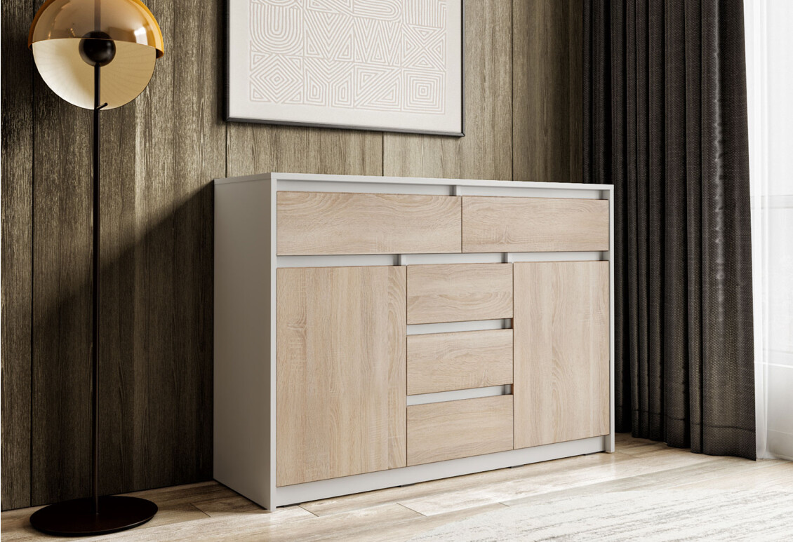 Комод Moreli Т227 — це стильний та функціональний елемент меблів, який стане чудовим доповненням до вашого інтер'єру. З його допомогою ви зможете організувати простір, зберігаючи порядок у вашій оселі. Завдяки сучасному дизайну та універсальному кольору, що поєднує білий та дуб сонома, цей комод легко впишеться в будь-який стиль оформлення. Його конструкція включає 5 шухляд та дверцята, що забезпечують достатньо місця для зберігання речей. Комод виготовлений з ламінованої ДСП, що гарантує надійність та довговічність, а також легкість у догляді. Зверніть увагу, що комод доступний у різних модифікаціях кольору, що дозволяє вам обрати найкращий варіант для вашого інтер'єру.