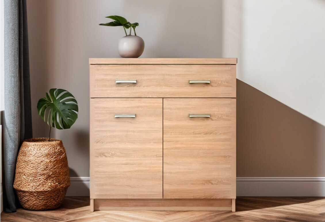 Комод VMV holding Топ-мікс 2-дверний з шухлядою – це стильний та функціональний елемент меблів, що ідеально підходить для використання в сучасних інтер'єрах. Його компактні розміри (ширина 60 см, висота 85 см, глибина 33 см) дозволяють легко вписати комод у будь-який простір, навіть у невеликих кімнатах. Виконаний з ламінованої ДСП, цей комод має високу міцність і стійкість до механічних пошкоджень. Модель оснащена пластиковими ручками та роликовими напрямними, що забезпечують зручність у використанні. Колір дуб сонома надає виробу елегантного вигляду, а стиль модерн робить його універсальним для різних інтер'єрних рішень.