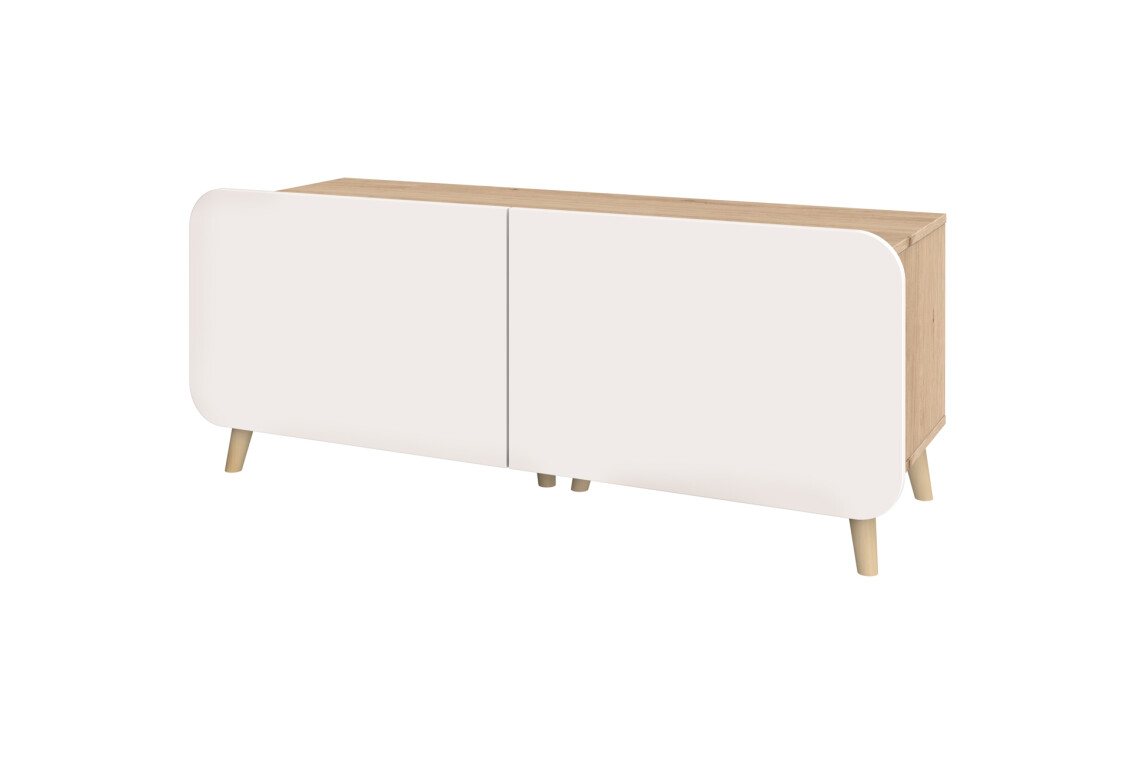 Тумба під ТВ Київський стандарт Руна 2-дверна – це ідеальне рішення для вашої вітальні, яке поєднує в собі стильний мінімалізм та практичність. Завдяки своїм компактним розмірам (ширина 126 см, висота 50.5 см, глибина 45 см), вона легко впишеться в будь-який інтер'єр, не займаючи багато місця. Виготовлена з надійних матеріалів, таких як ламінована ДСП для корпусу та МДФ для фасаду, ця тумба забезпечує довговічність і стійкість до пошкоджень. Дерев'яні ніжки надають їй елегантного вигляду та забезпечують стабільність. Відсутність ручок створює чистий та сучасний вигляд, а поєднання кольорів дуб рая та білого софту додає легкості та свіжості в інтер'єр.